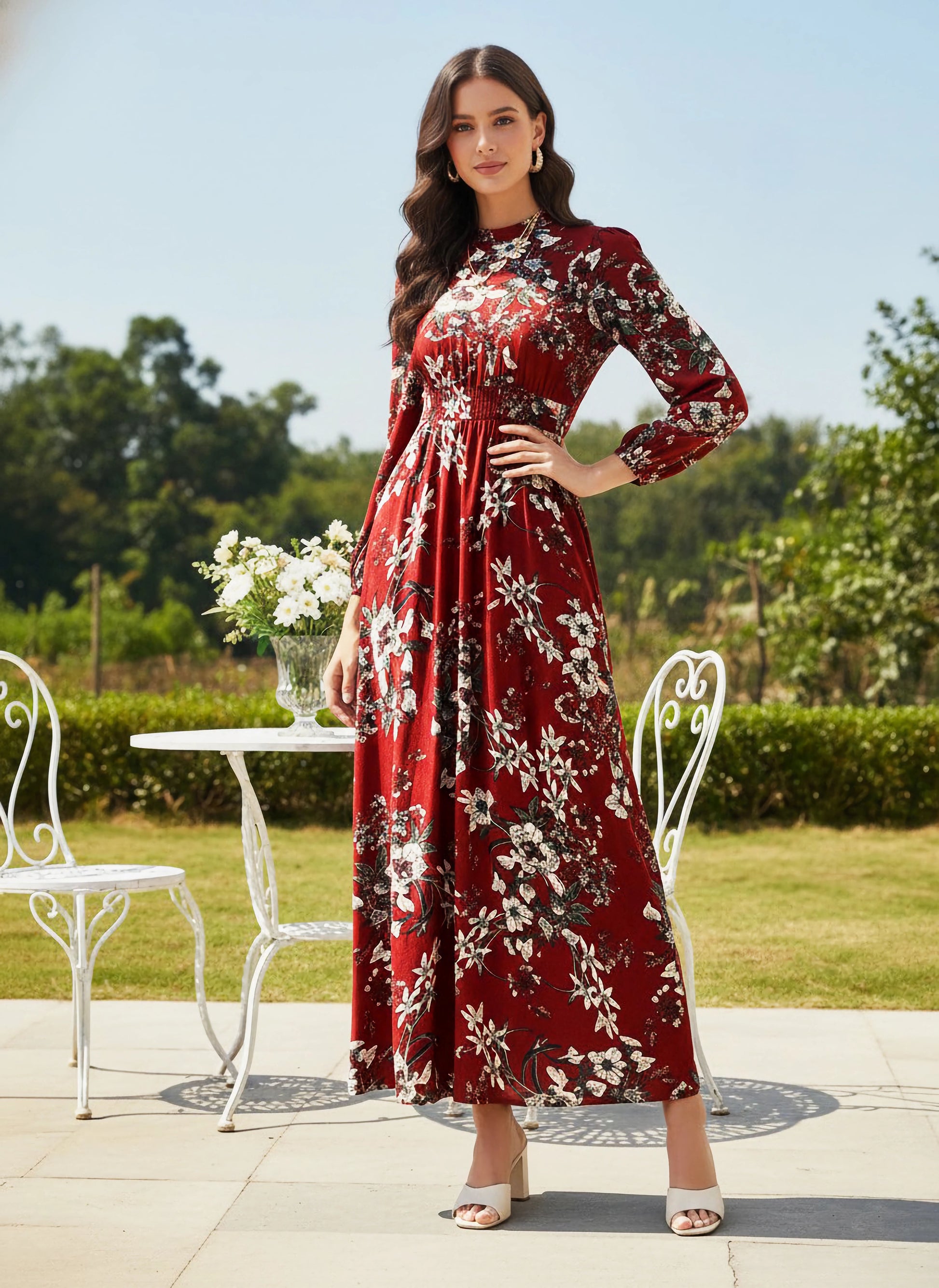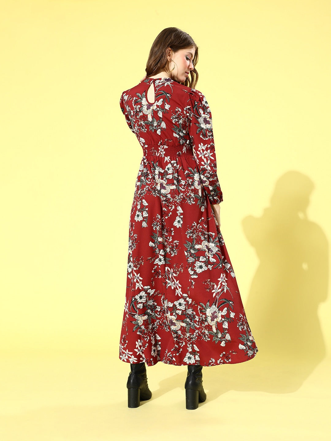 Get the natural blush by decorating your casual outing with this Maroon Floral Printed Mock Neck A-Line Maxi Dress from Berrylush. The long bishop sleeves add a chic flair to your overall look and with the maxi length of the dress, your overall height attains a hype naturally. The A-line skirt helps retain the shape of your body proportion brilliantly. Features smocked detailing at the waistline, your aura gets another level of elegance. The captivating allover floral design of the maxi dress flatters your entire appearance with its alive styling element. Style this flowery rousing maxi dress with strappy heels and become the sensational model of the casual look by Berrylush.