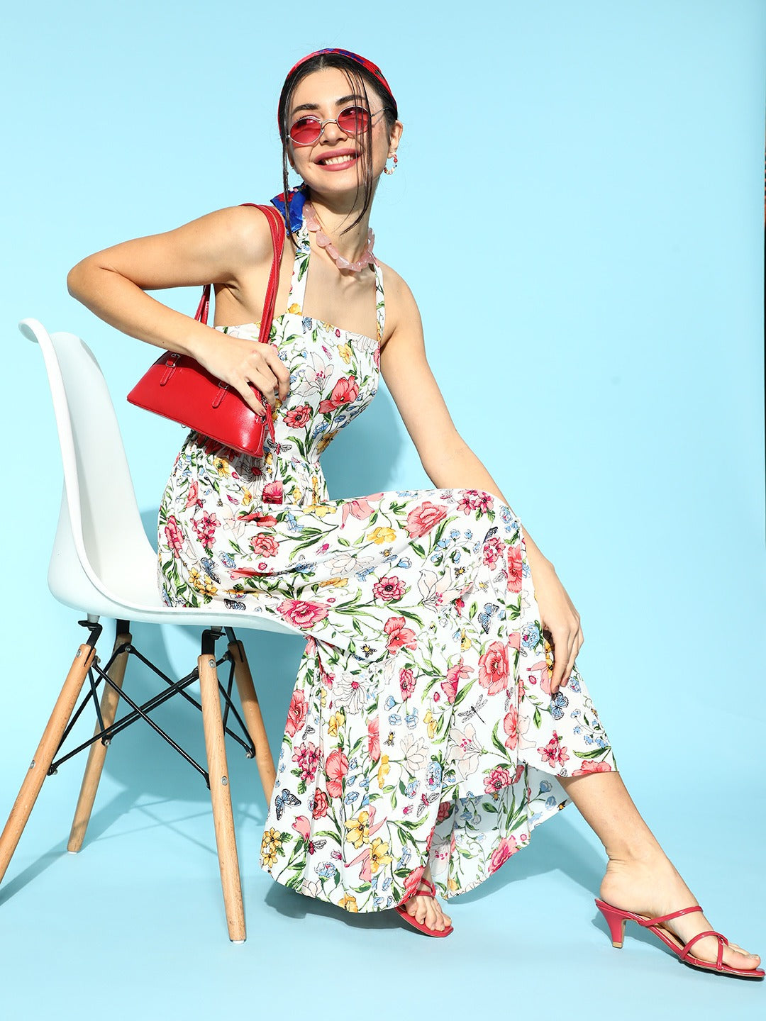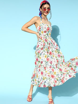 Be on top of your fashion game while maintaining your fashion goals with this gorgeous White & Pink Floral Printed Square Neck Criss-Cross Back Flounce Hem Ruffled A-Line Midi Dress introduced by Berrylush. Tailored in an A-line shape to lend this dress sartorial perfection with a curve-hugging silhouette that elegantly highlights the feminine side of your body. This dress assures a soothing and super soft touch against your skin as it is made of crepe viscose rayon material that offers absorbent ability. Designed with concealed zip closure that offers this dress a functional bonus with an easy and secure fastening process. Complete your casual look fashionably by partnering up this midi dress with a pair of red caged heels, colourful hoop earrings, triangular sunglasses, and a sassy purse.