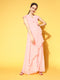 Berrylush Women Solid Peach Dobby Weave V-Neck Waist Tie-Up Flared Wrap Maxi Dress