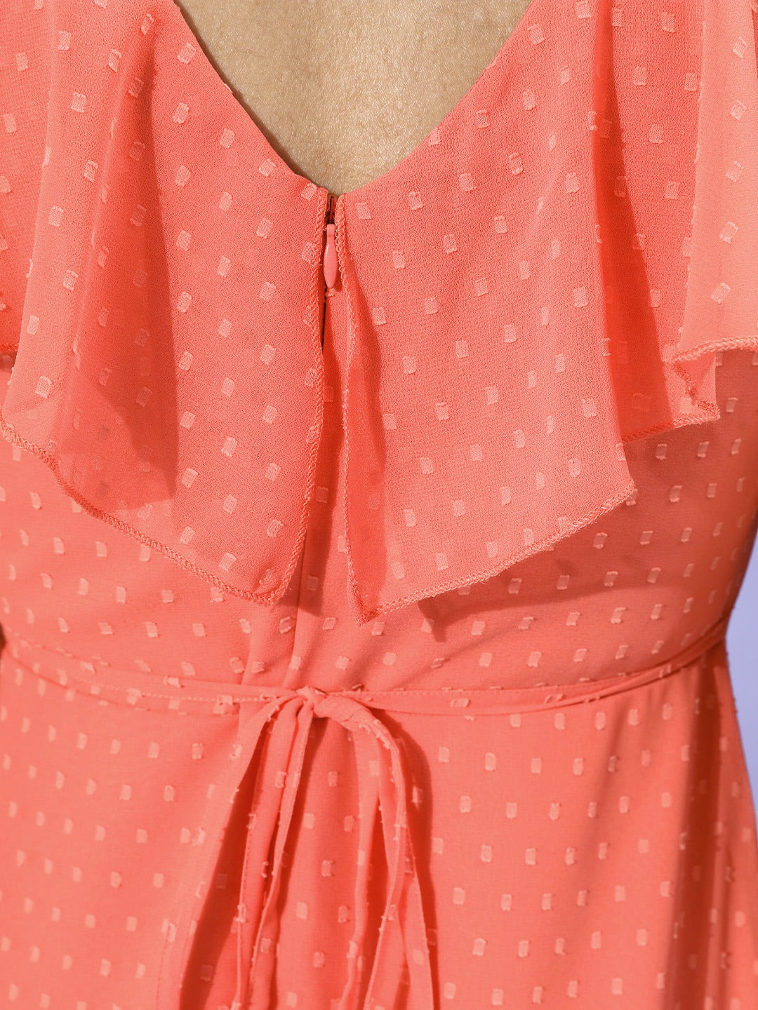 Lie the foundation of your capsule party closet in minimalistic details and sublime beauty that never goes out of fashion just like this Solid Peach Dobby Weave V-Neck Waist Tie-Up Flared Wrap Maxi Dress designed by Berrylush. The wrap style offers this dress a figure-flattering silhouette which further highlights your attractive curves. Crafted with georgette polyester material that makes this dress lightweight with a flowy design. Moreover, the V-neck design provides your neckline with an alluring outline with a breathable structure. Complete your party looks amusingly by pairing up this ruffled dress with a pair of block heels, classy diamond earrings, and a sling bag.