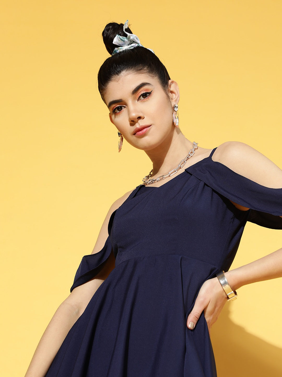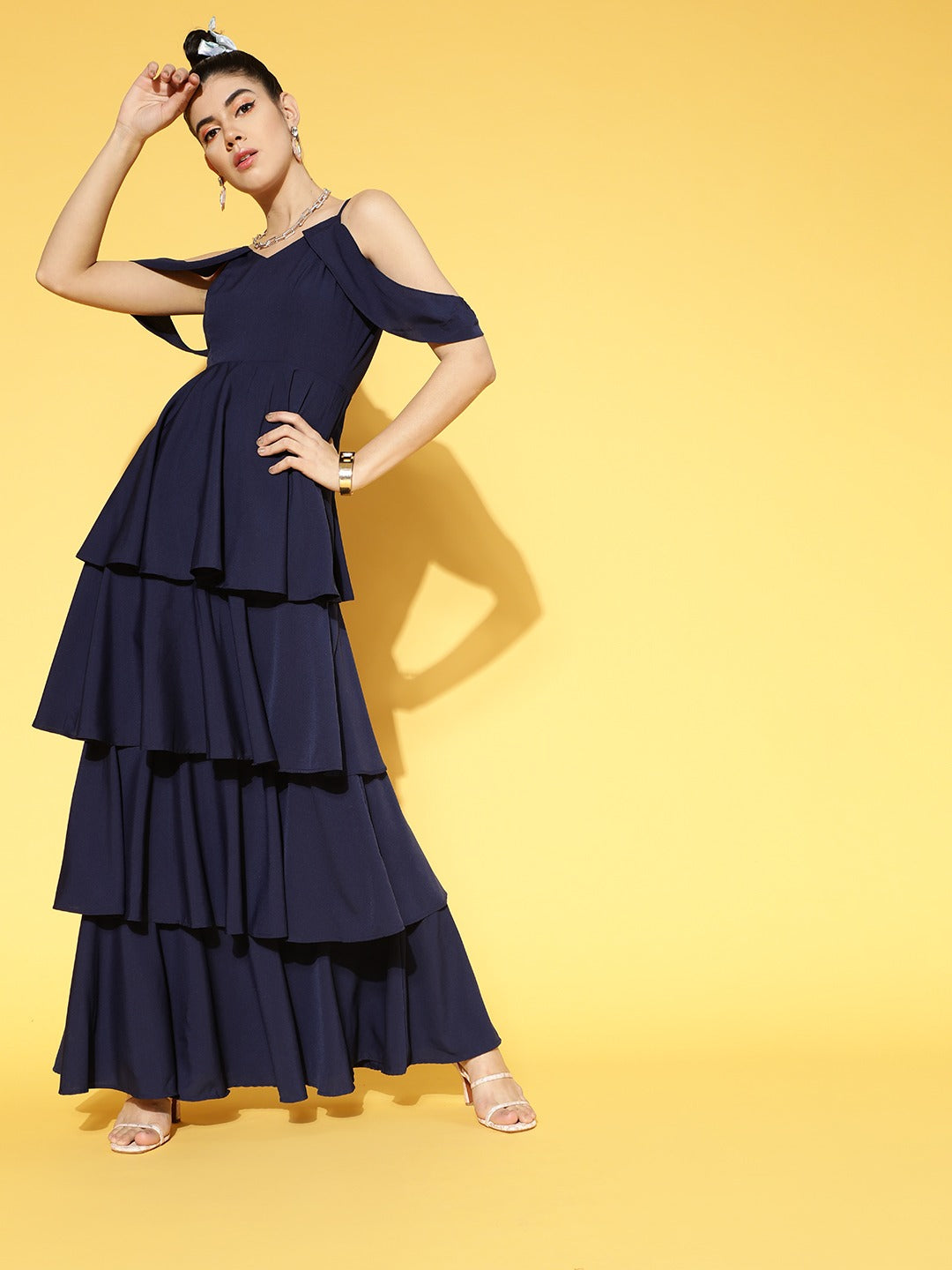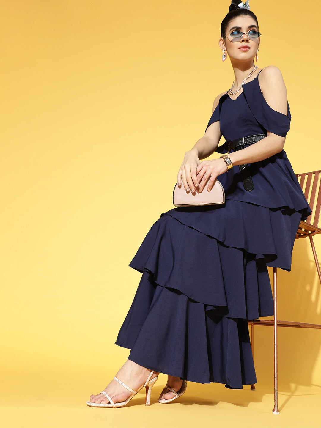 Berrylush Women Solid Navy Blue V-Neck Cold-Shoulder Flounce Hem Layered A-Line Maxi Dress