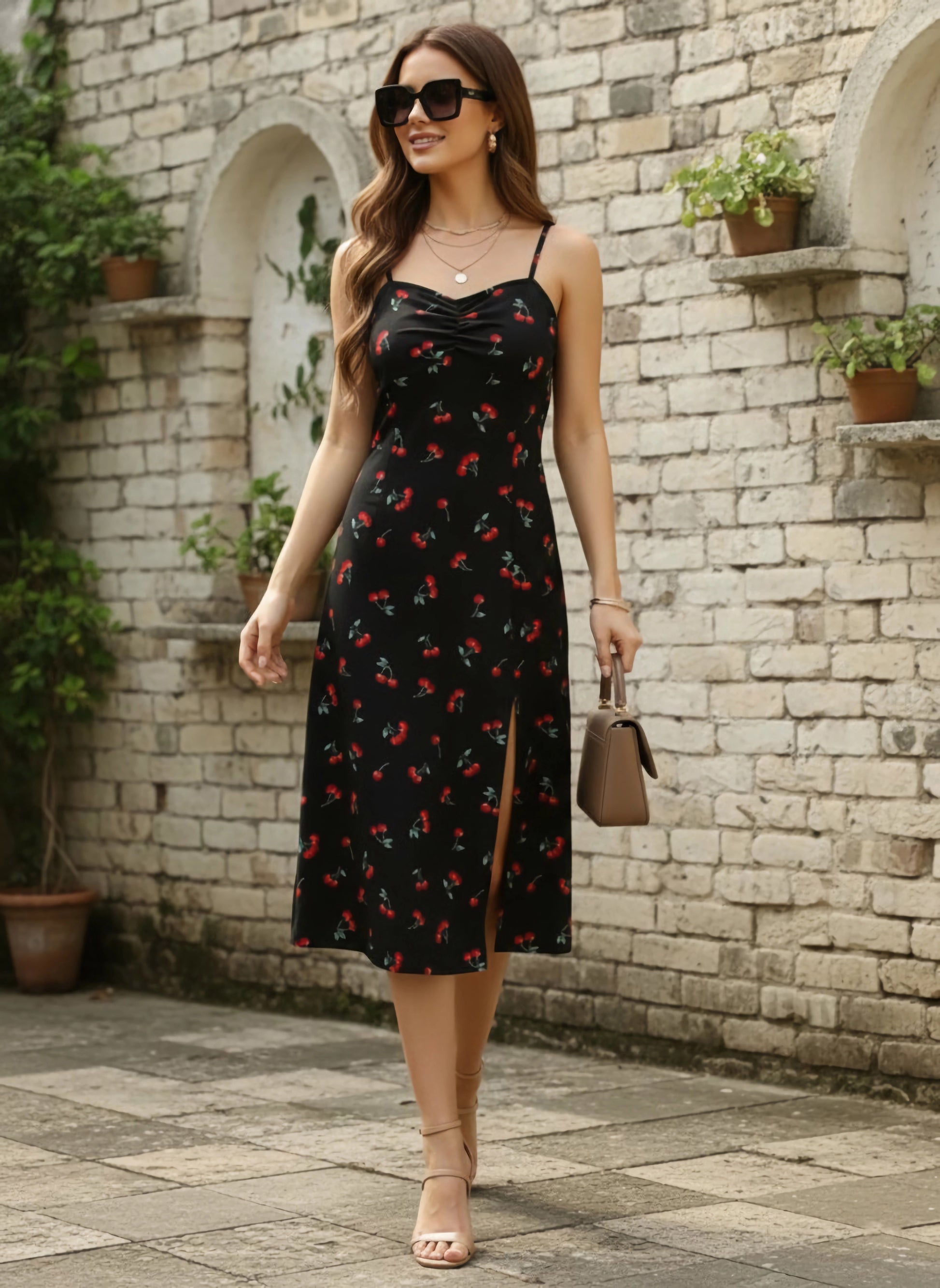 Be the epitome of romance with a voguish and cinematic style by donning this captivating Black & Red Cherry Printed Sweetheart Neck Straight Hem Slited A-Line Midi Dress from Berrylush. Framed in an A-line shape that lends this dress contouring fit to your upper body with a hint of flattering design to your lower body to maintain a perfect balance of charm. Showcasing side slit design of this dress which gives an exotic exposure to your legs for a sexy look and ventilated features. Also, the gathered surface styling enhances the beauty of this dress by injecting an ornamental and charismatic sheen. Pair up this midi dress with red sneakers, a headband, shimmery neck chains, and a cute side bag to create a fashion-focused appearance.