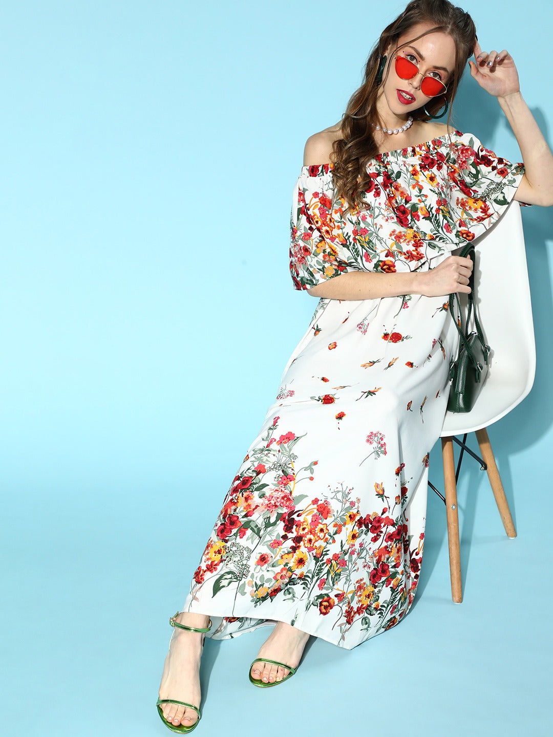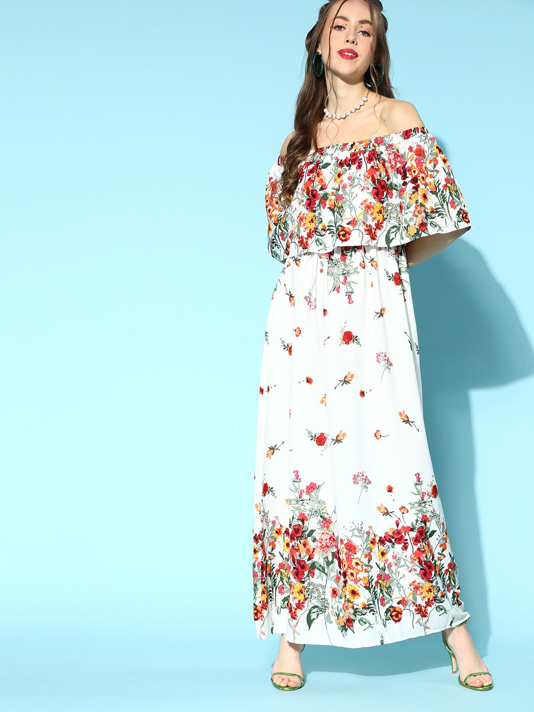 Boost the feminine and sensuous vibe within your capsule closet by getting this beautiful White & Red Floral Printed Off-Shoulder Neck Crepe Layered Maxi Dress launched by Berrylush. Enlivened by an astonishing flared hemline that creates a boho-chic look by adding captivating flairs to this maxi dress. Fashioned with woven detailing to provide this dress with better structural integrity accompanied by delicate touch to avoid any kind of skin allergies and irritation. Punctuated from the finest crepe polyester fabric to offer outstanding abrasion resistance properties with an amazing drape that further gives this dress a bouncy appearance. Enjoy an outdoor party in a fashion-flattering look by wearing this maxi dress with a pair of stunning high-heels, pearl jewellery, and a metallic sling bag.