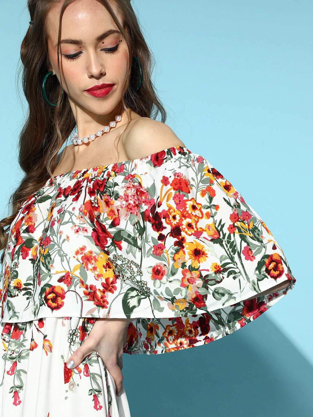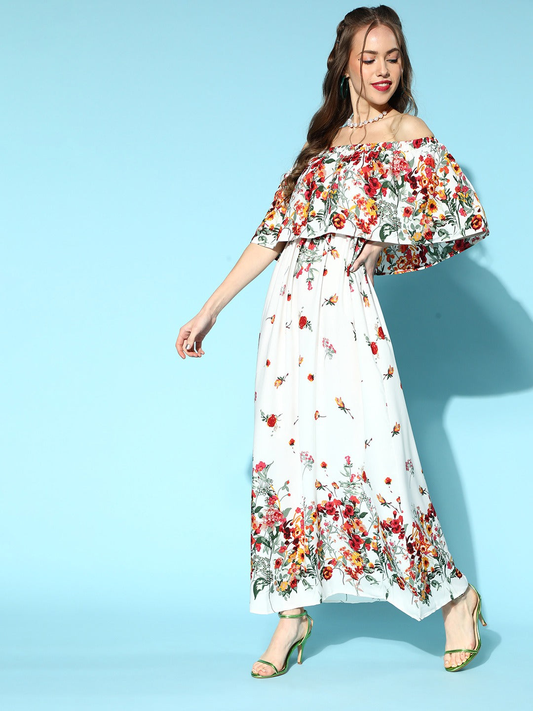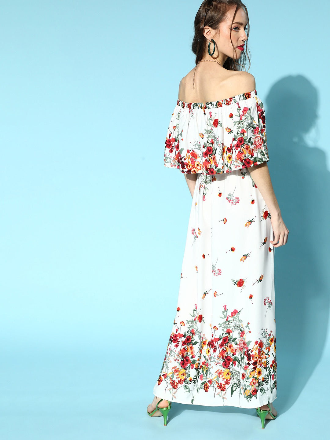 Berrylush Women White & Red Floral Printed Off-Shoulder Neck Crepe Layered Maxi Dress