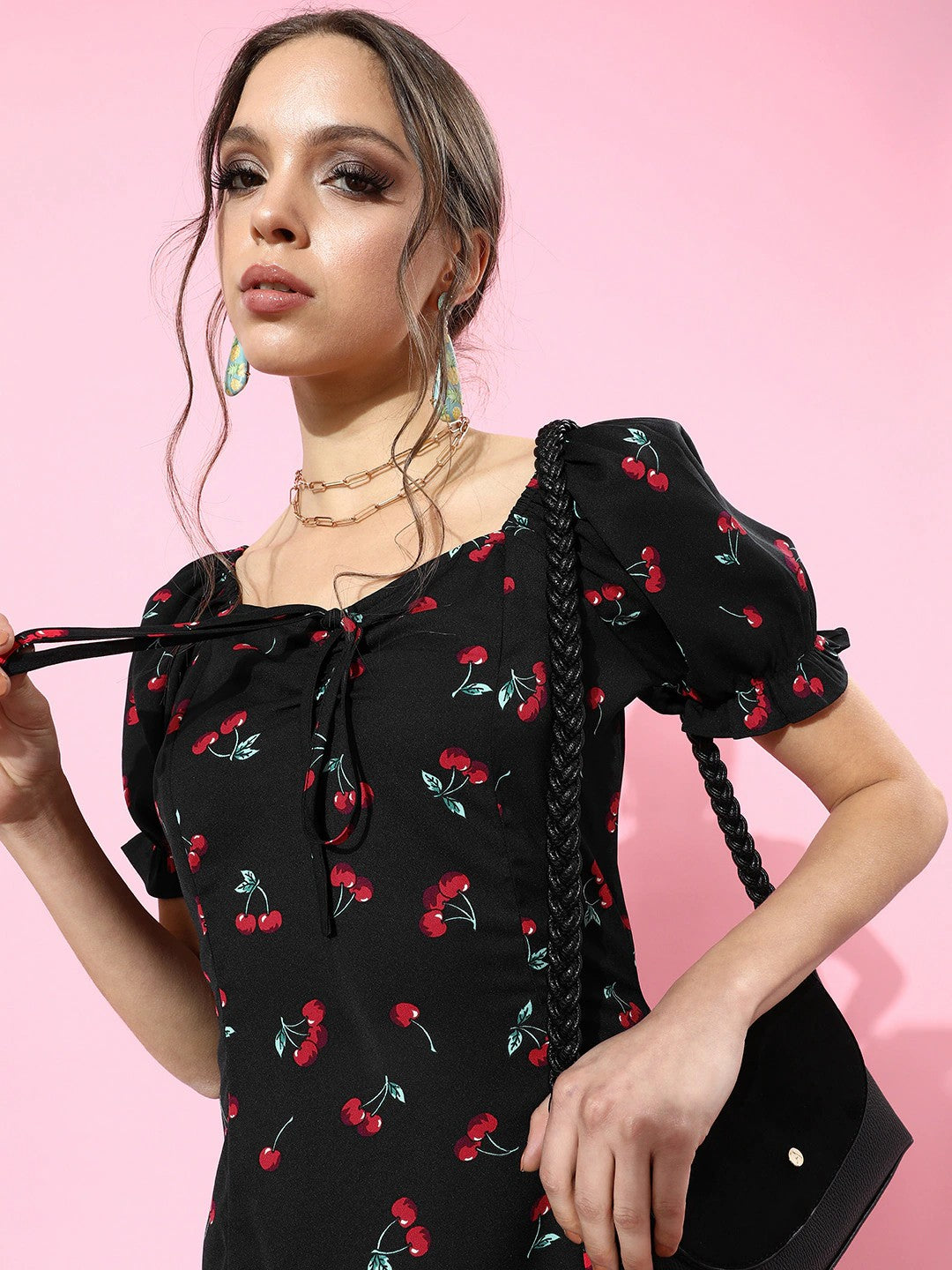 Presents a glimpse of sophistication, chicness, and flattering silhouette by wearing this Black & Red Cherry Printed Sweetheart Neck Crepe Ruffled A-Line Midi Dress from Berrylush. Tailored in an A-line shape that gives this dress a contouring silhouette from the shoulders to the waist area which is further accompanied by flared shape bottom. Presenting a sweetheart neck design that adds a hint of romantic essence to your casual look with a heart shape outline to your beautiful neckline. Styled with short-puff sleeves that present a classy mixture of 80's style with a modern twist and touch to make this dress appear captivating. Team up this tiered dress with a pair of black wedges, a double-layer neckpiece, and a sassy side bag for creating a charming look.