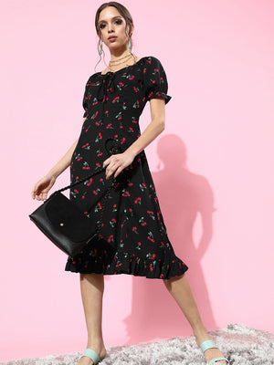 Berrylush Women Black & Red Cherry Printed Sweetheart Neck Crepe Ruffled A-Line Midi Dress