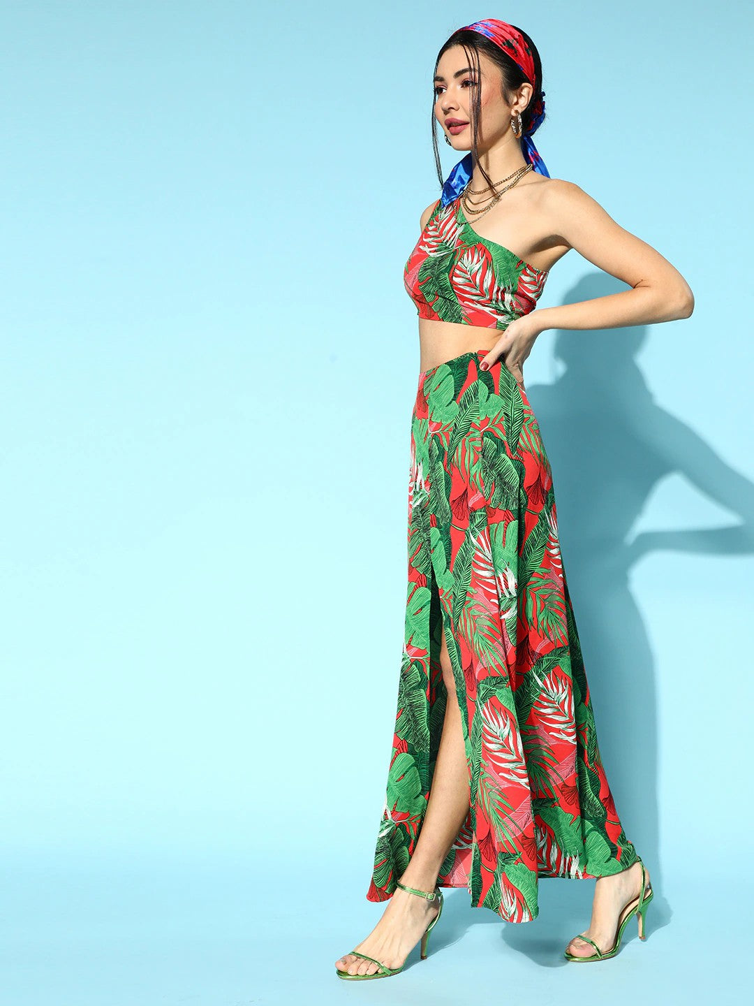 Berrylush Women Green & Red Floral Printed One-Shoulder Neck Thigh-High Slit Maxi Co-Ordinate Set