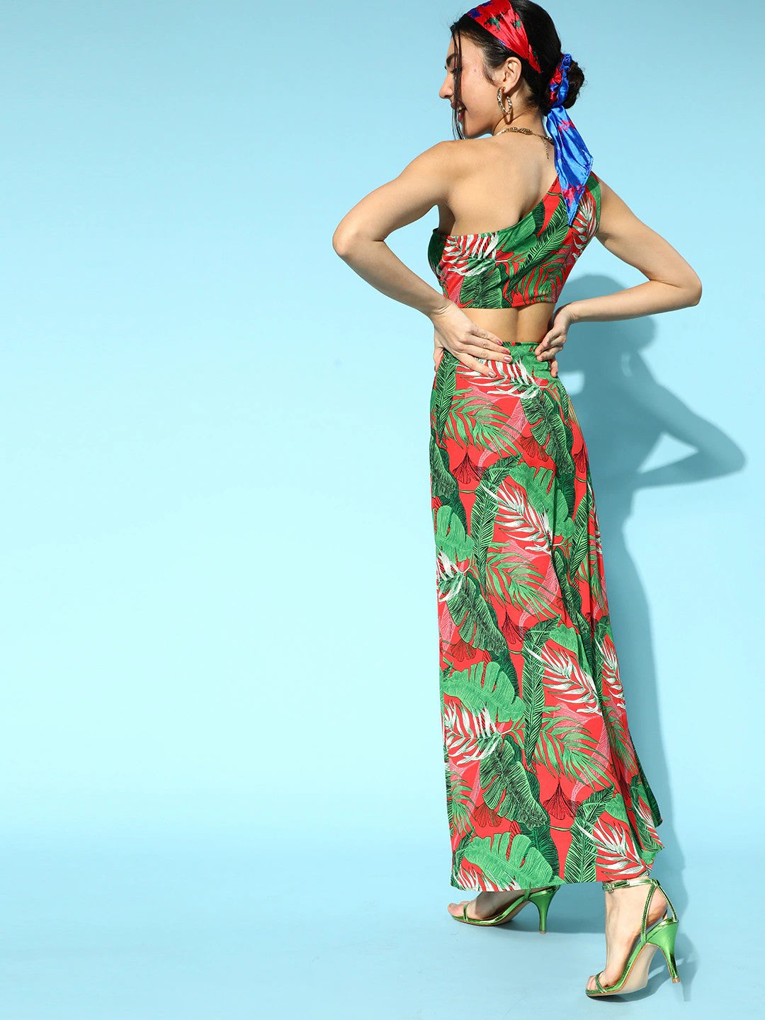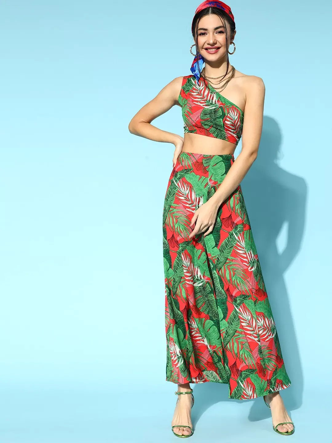 Welcome the summer season with enchanting style and comfy outfits just like this Green & Red Floral Printed One-Shoulder Neck Thigh-High Slit Maxi Co-Ordinate Set presented by Berrylush from its summer wear collection. Featuring an astonishing one-shoulder neck design that gives your neckline a bewitching outline. Designed with concealed zip closure to provide both the top and skirt a refined sheen with an easy-to-wear style. Also, this co-ord set is made of the finest polyester fabric to offer amazing moisture-wicking properties with stain-resistance attributes. Wear this printed co-ord set with green caged heels, minimalistic jewellery, a matching headband, and a fashionable dark green purse to get a jaw-dropping outlook.