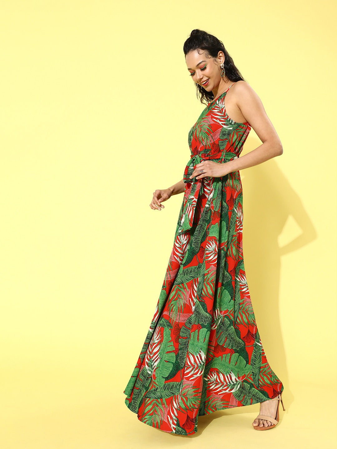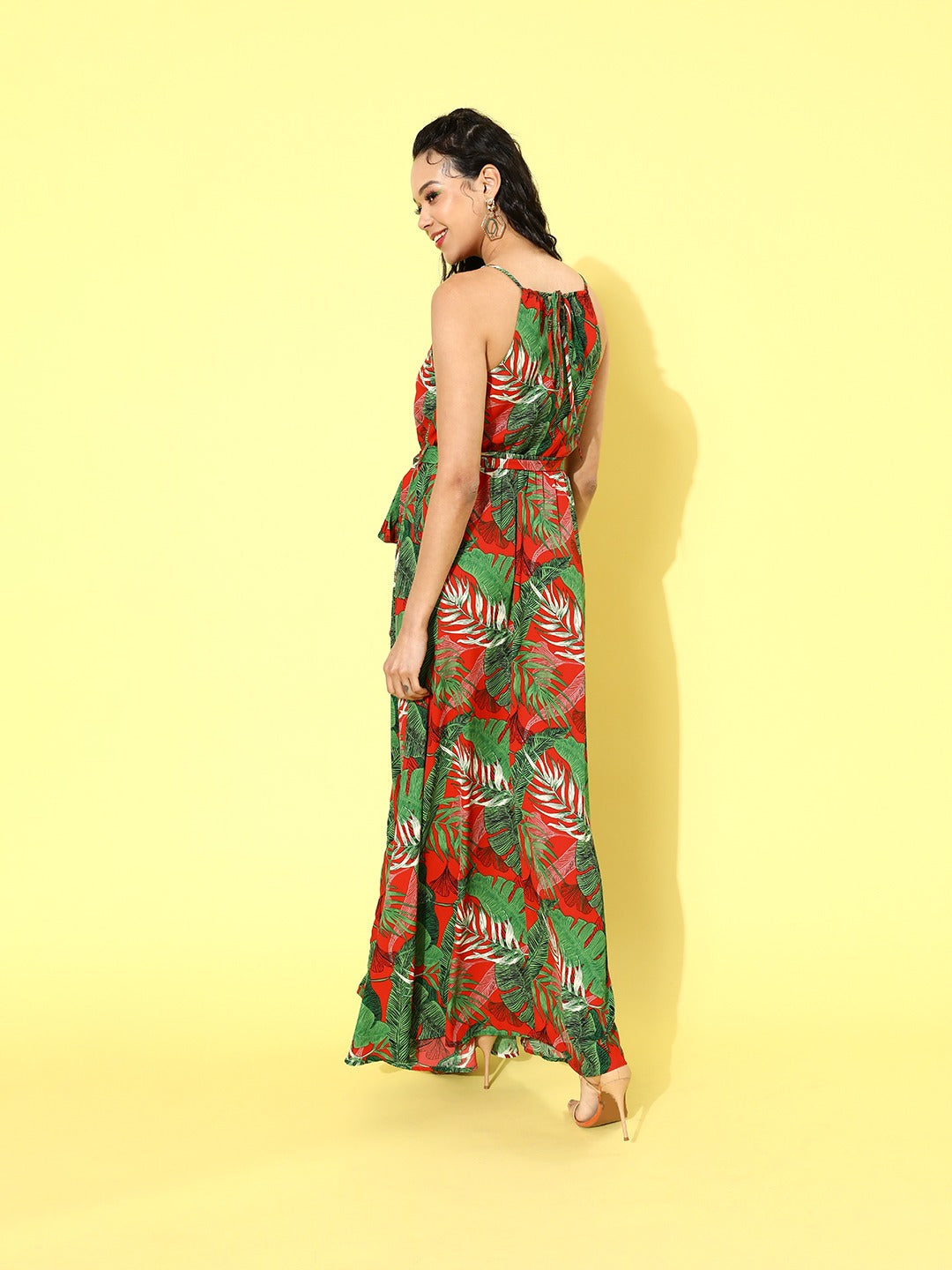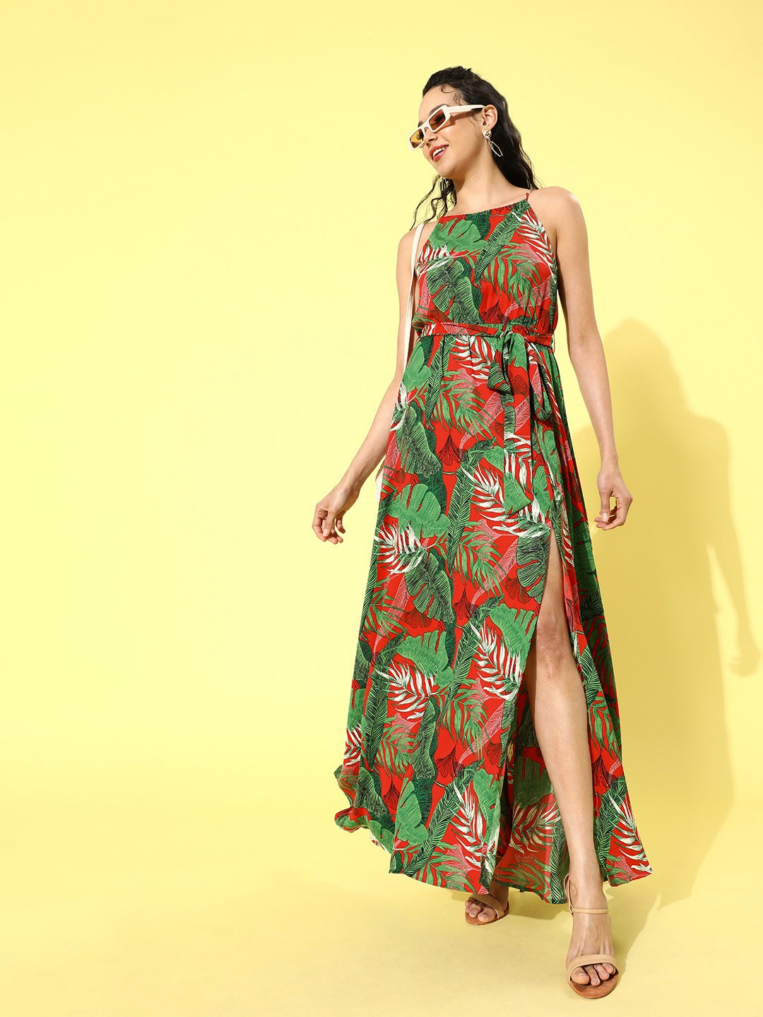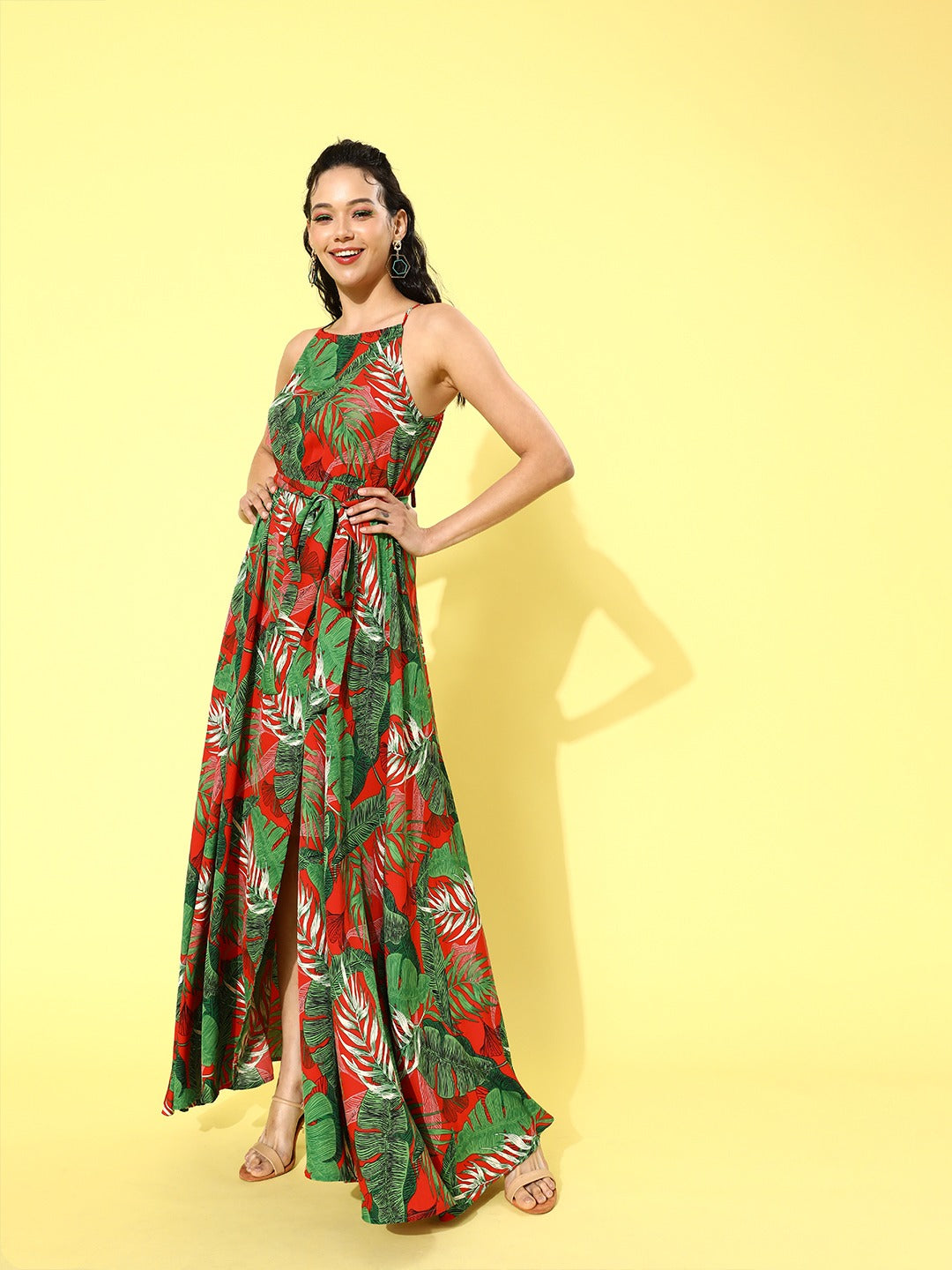 Berrylush Women Green & Red Tropical Printed Round-Neck Thigh-Slit Maxi Dress