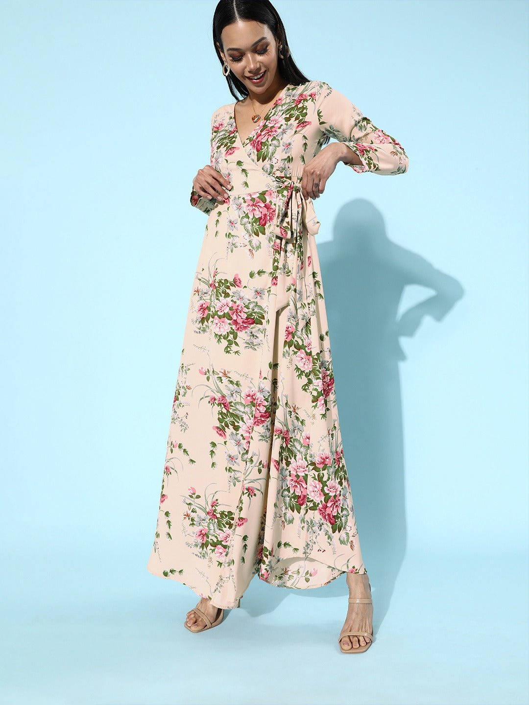 Inject a bewitching and free-spirited feel to your urban wear closet with this beautiful Beige Floral Printed V-Neck Wrap Style Maxi Dress from the floral print collection of Berrylush. Punctuated from a lightweight crepe polyester fabric to give moisture-wicking property and an amazing drape. The wrap style of the maxi dress state out a unique and fashion-flaunting casual look and the tie-up detail gets you a curve-hugging silhouette. Designed with long and regular sleeves to offer constraint-free actions to your arms with a smooth sheen while the maxi length adjoins with flared hem add a decorative texture to your overall look. Team up this cinematic maxi dress with a pair of strappy heels and a lean handbag to add a feminine charm to your casual outlook.