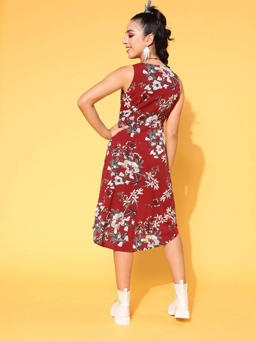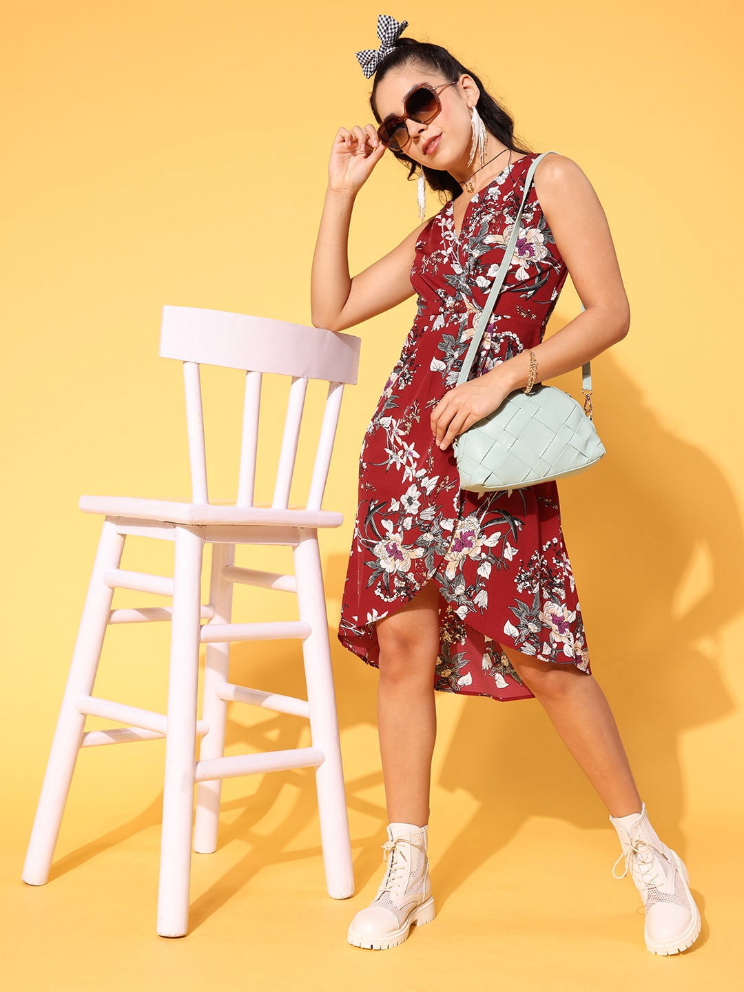 Don't let the summer heat overshadow your stylish look with this mesmerizing Maroon & White Floral Printed V-Neck Crepe Tulip Hem A-Line Midi Dress from Berrylush. Framed in a tulip hemline that presents an illustration of asymmetric design which makes your lower body portion appear more attractive and eye-catching. Featuring an A-line shape that provides a contoured and figure-defining silhouette that highlights your feminine body features. Comes with woven detailing to enhance the overall durability of this dress along with an elastic nature. Team up this A-line dress with a pair of white sneakers and a cool side bag to get a relaxing style for enjoying your day out on weekends.