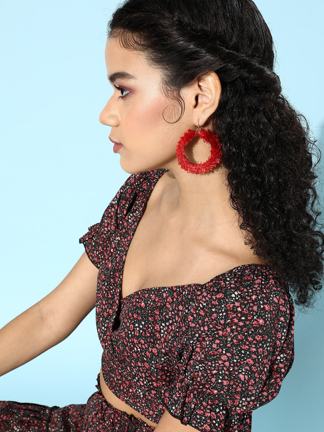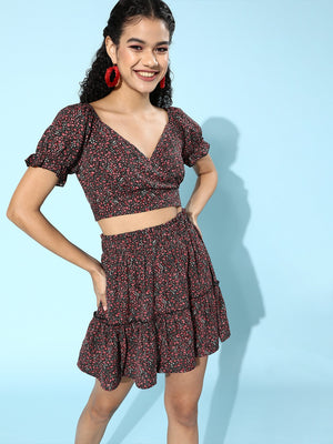 The colour black has many secrets hidden inside it and it becomes mysterious when you wear this Black Floral Printed Sweetheart Co-Ordinate Dress from Berrylush. With a charming sweetheart neckline, this dress flaunts your toned collarbone and the short puffed sleeves fill a feminine aura to your arms. With the floral print, your overall appearance looks vibrant and energetic. The cropped length top adds up an extra supple and cuteness to your torso area. Along with the crop top, the lower part also got another stylish mini skirt that comes with a beautiful flared hemline. Match this pleasing mini dress with low-top sneakers and you are all set to create a cool fashion language with Berrylush.