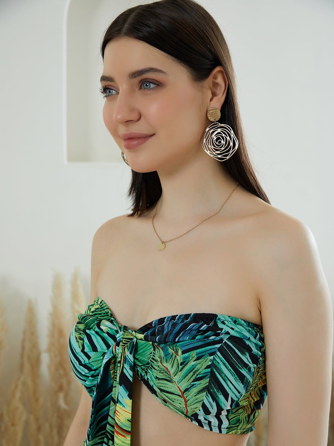 Prioritize your comfort this summer season with super trendy style by donning this Green & Black Floral Printed Strapless Neck Thigh-High Slit Crop Top & Maxi Skirt Co-Ordinate Set from Berrylush. Defined by captivating green and black tropical print all over this top and skirt set for a chic and urban twist. Punctuated from breathable crepe polyester fabric that provides this top and skirt set with a quick-drying feature. The sleeveless design of this top lends your beautiful arms an alluring appeal while keeping them cool and comfy all day long. Enjoy your holidays in a stylish look by wearing this tropical print top and skirt set with a pair of comfortable flats, tassel earrings, a straw hat, and a sling bag.