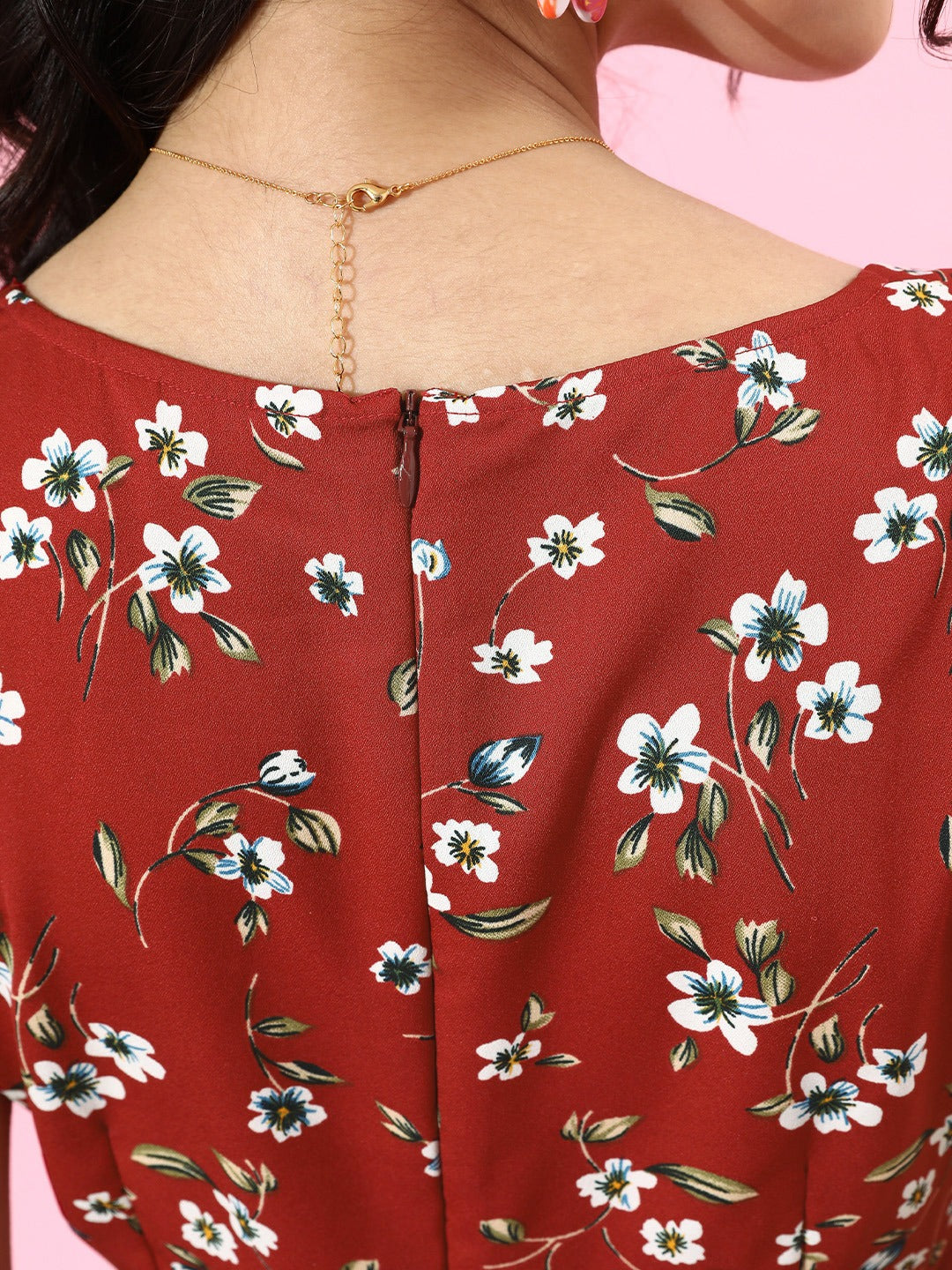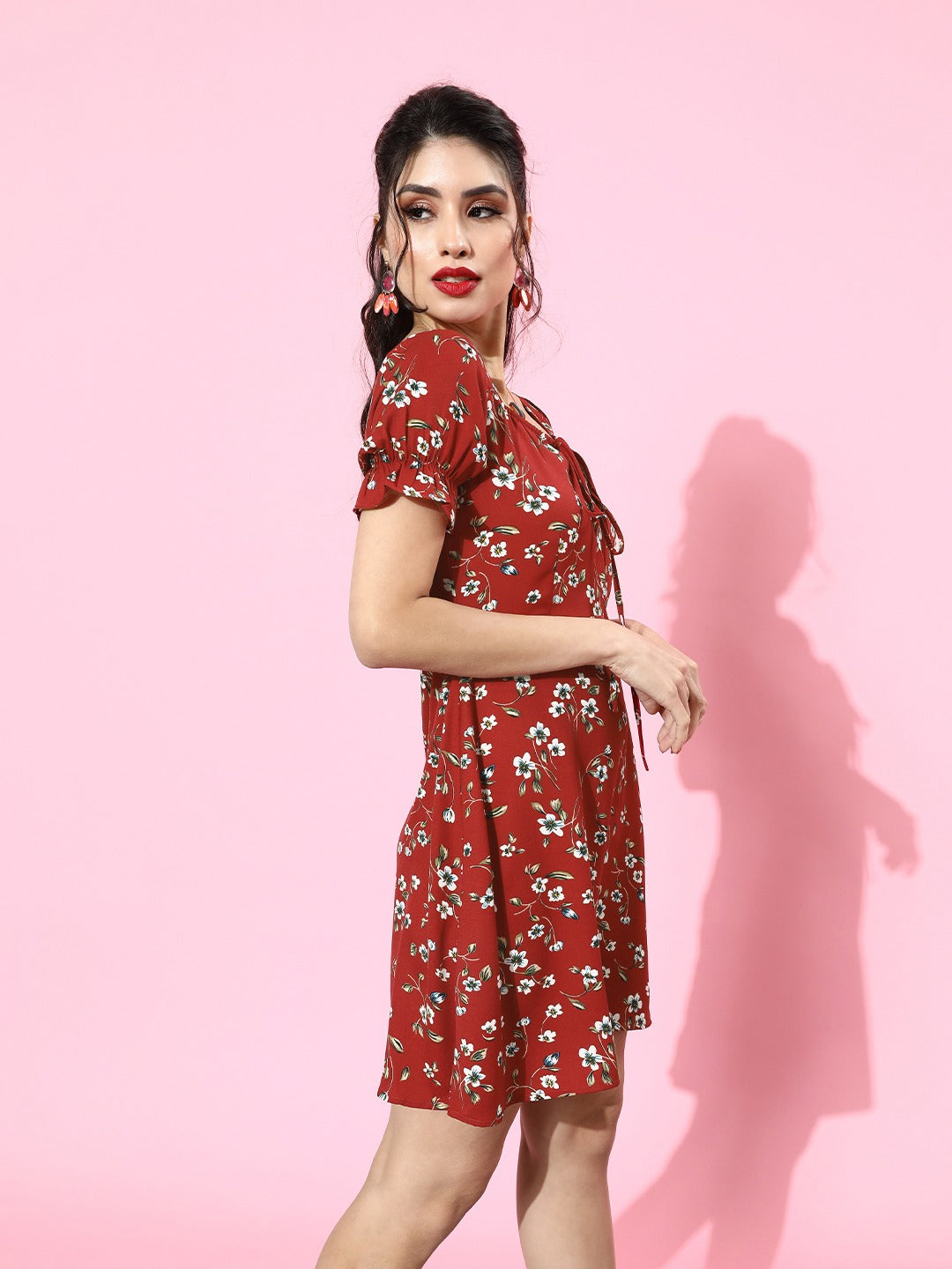 Berrylush Women Red & White Floral Printed Sweetheart Neck Tie-Up Front Crepe Fit & Flare Mini Dress