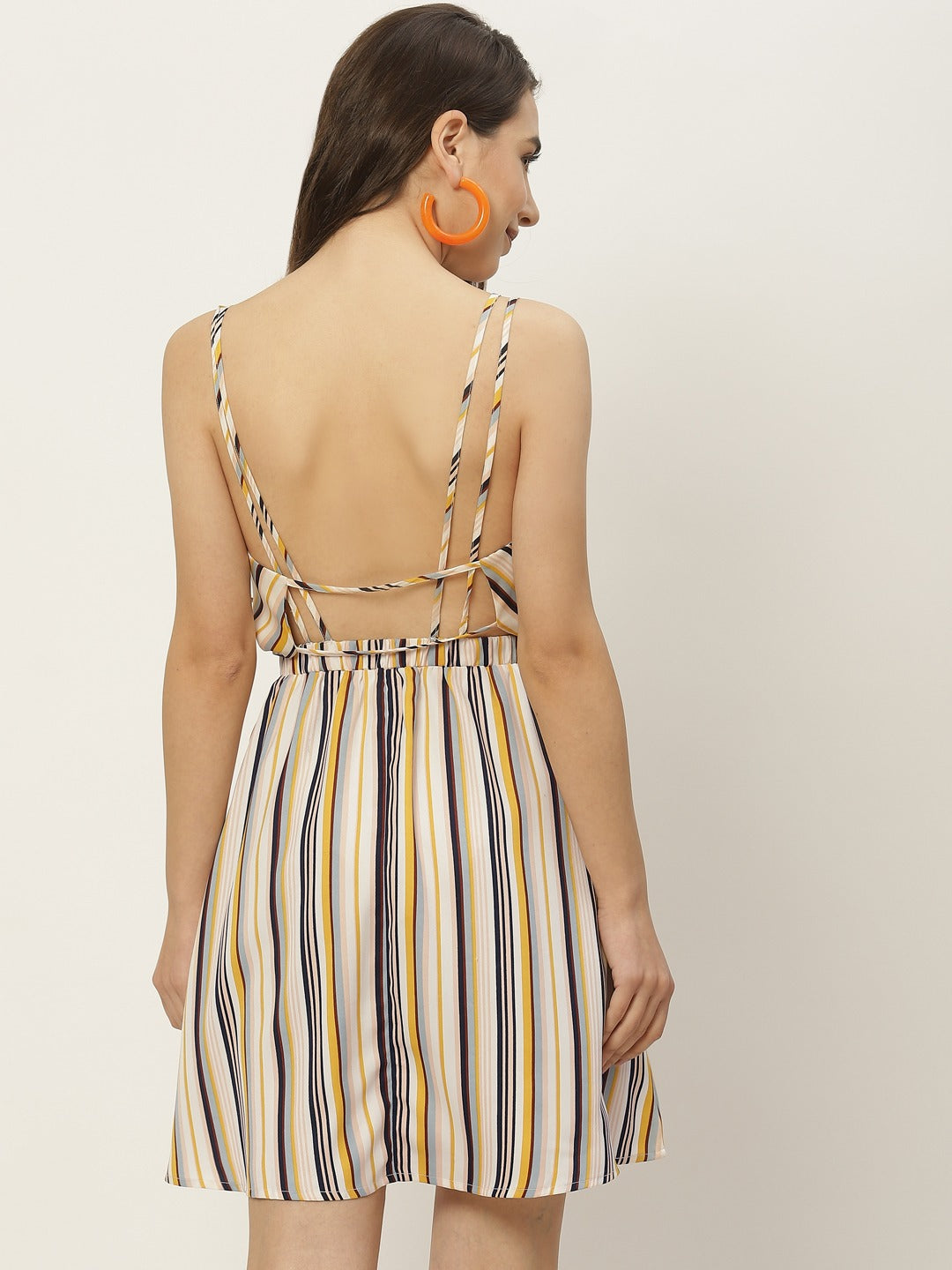 Set your unique definition of the latest party style that leaves people jaw-dropping by donning this White & Multicolour Stripe Printed V-Neck Open Back Straight Hem A-Line Mini Dress from Berrylush. The most mesmerizing detail of this dress is its backless design that gives an eccentric appeal to your beautiful shoulders and rib area while lending this dress an extravagant note. Fashioned in an A-line shape that provides this dress is an illustration of skater style that offers a narrow and contouring silhouette. Designed with flared hemline to adjoin a bouncy drape and volume to this dress that makes your look appear fascinating. You can wear this skater dress with a pair of white block heels, fun hoop earrings, and a yellow geometric shape side bag for a fashionable appearance.