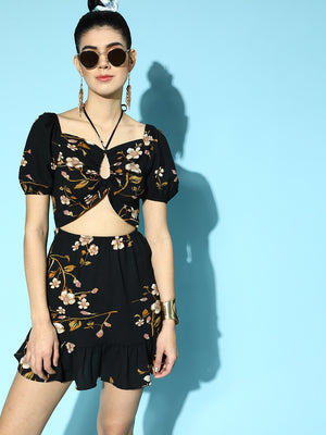 Berrylush Women Black & Beige Floral Printed Sweetheart Neck Front Keyhole Ruffled A-Line Mini Dress