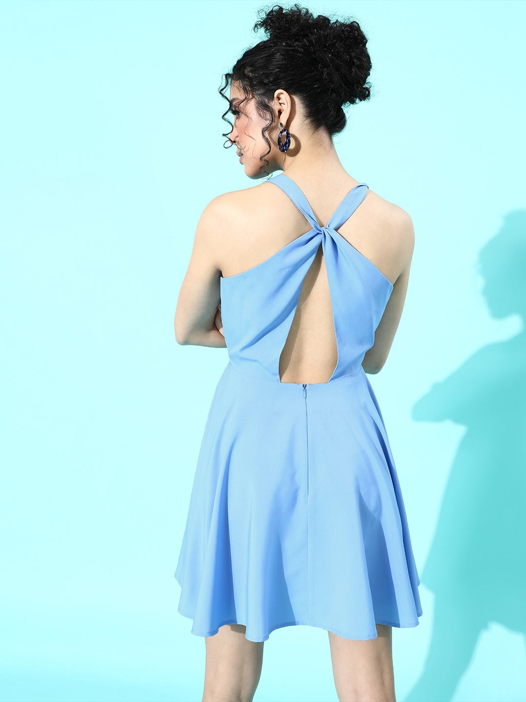 Berrylush Women Solid Blue Twist Back Skater Fit & Flare Mini Dress