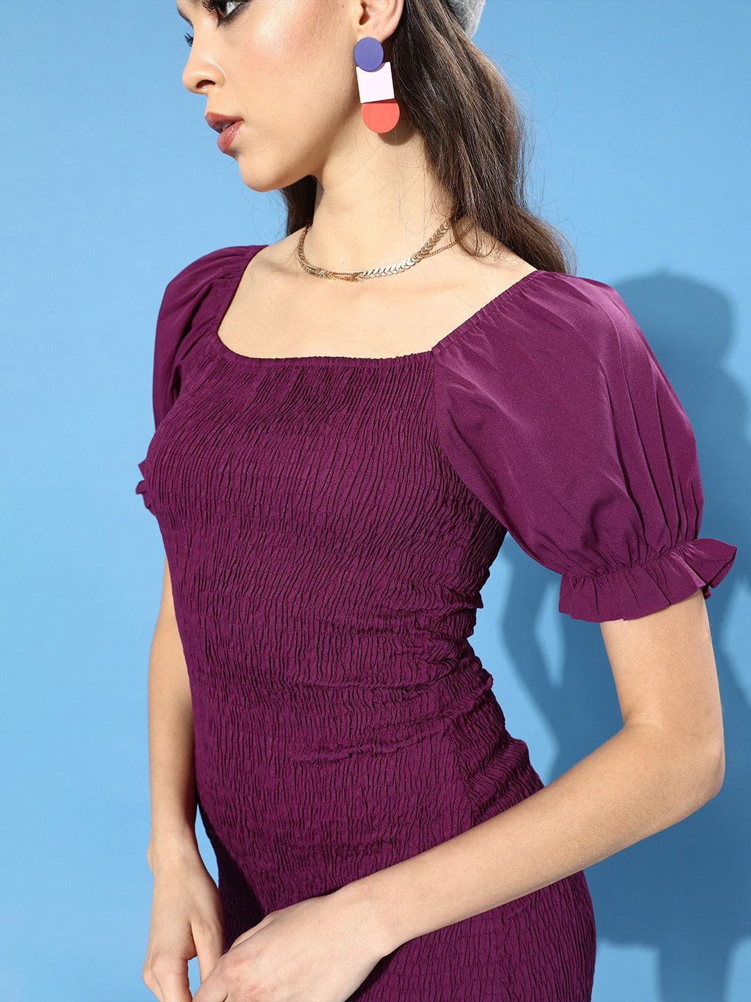 Introduce an alluring charm into your peculiar party style with this charismatic Solid Purple Square Neck Crepe Bodycon Mini Dress from Berrylush. This dress is sure to add glam and seductive quintessence to your on-go party look with its bodycon shape as it gets you a body-hugging fit. The purple colour of the dress enables you to possess calm and stimulating characteristics further creating an impressive outlook. Curved out from crepe polyester fabric to support anti-shrink and anti-fade features with dazzling appeal. Beautifully designed square neck to get your neckline a universally attractive appearance. The short puffed sleeves redefine your arms to get a feminine look with a neat finish. You can pair this glamourous dress with block heels and a classic handbag to get a gracious final look.
