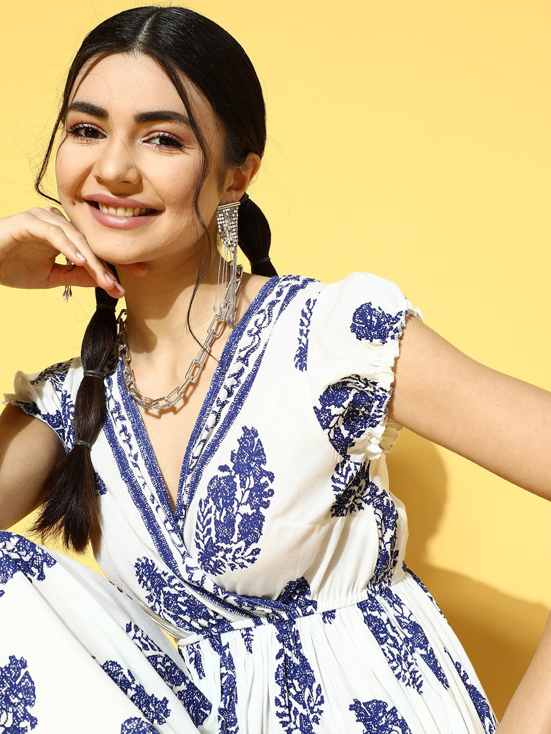 Berrylush Women Off-White & Navy Blue Ethnic Motifs Printed V-Neck Flared Wrap A-Line Mini Dress