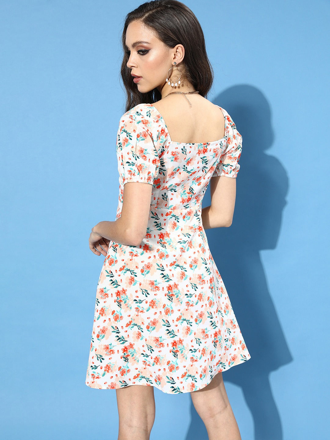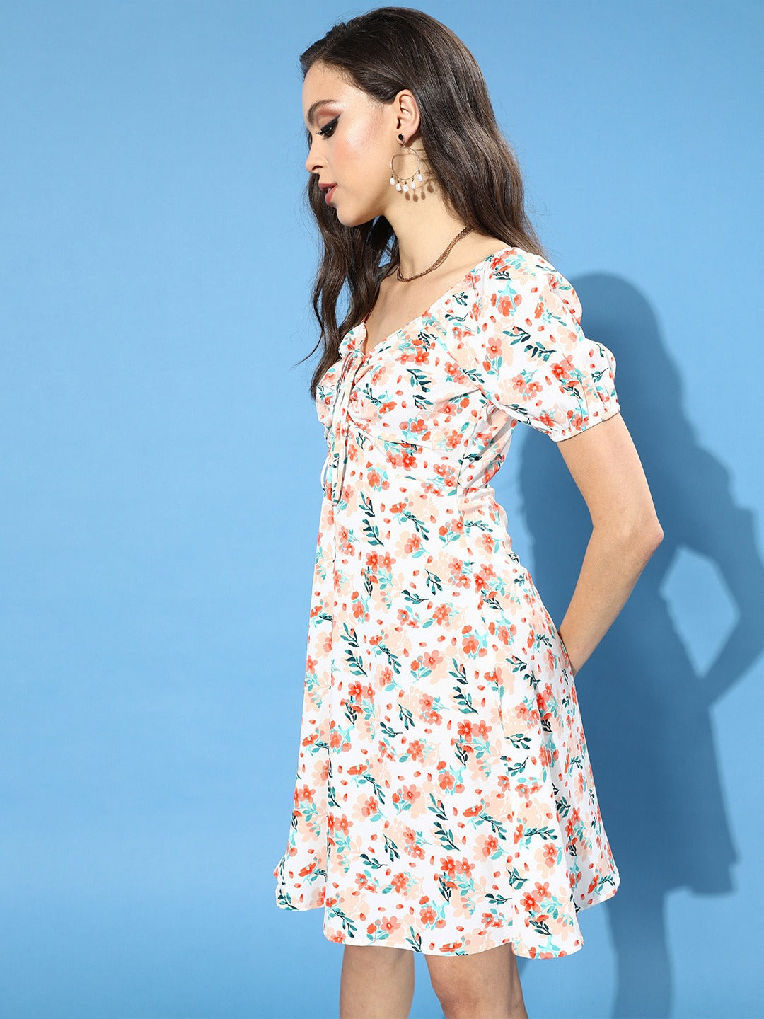 If you are looking for a fashionable and comfortable outfit to stay relevant through any season, then this flattering White Floral Printed Tie-Up Crepe A-Line Mini Dress from Berrylush is the perfect option for you. This dress is a must-have outfit for your wardrobe as its sweetheart neck design gives a charming appeal to your neckline. The short puffed sleeve represents your arms in an elegant and glamorous way while the concealed zip closure ensures you a supportive fit. Features a floral print theme for a natural and trendy outlook and the white colour of the dress depicts your dignified personality. The A-line shape gets you a chic appeal and the crepe polyester fabric provide a breathable attribute to make it a suitable wear for the extended duration on hot summer days. Match up this bewitching mini dress with platform heels and hoop earrings to get a sophisticated look.