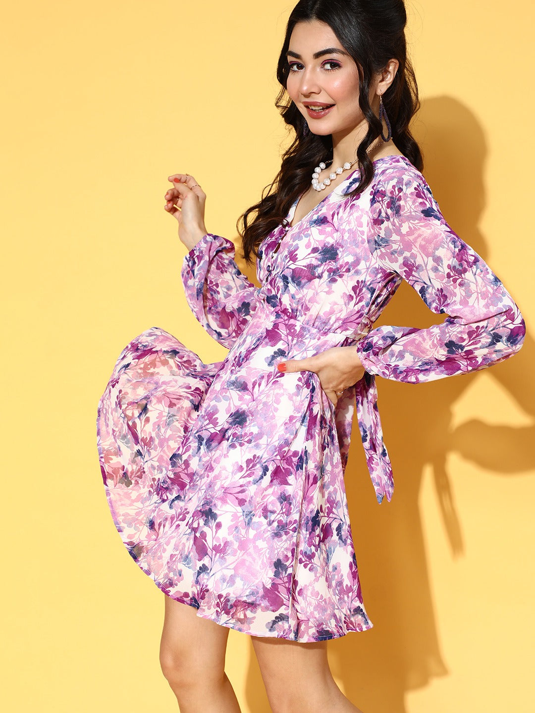 Berrylush Women White & Purple Floral Printed V-Neck Georgette Fit & Flare Mini Dress