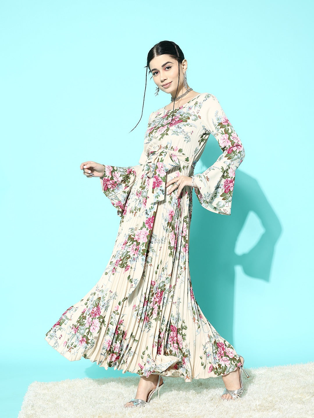 Berrylush Women Beige & Green Floral Printed Round Neck Bell Sleeves Waist Tie-Up Crepe Pleated A-Line Maxi Dress