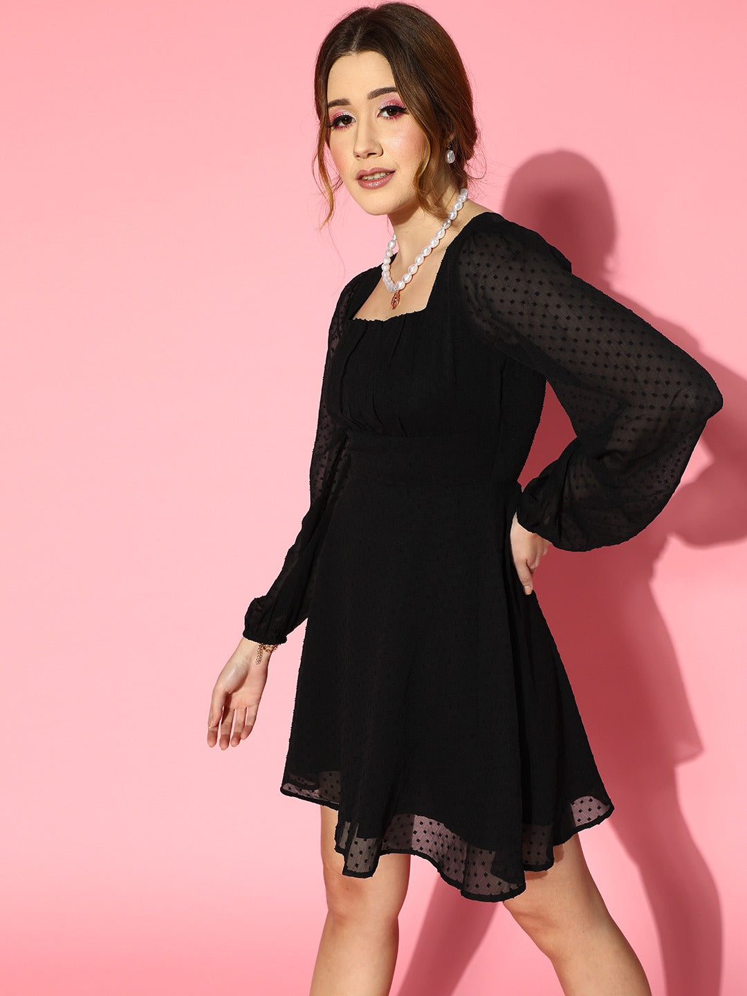 Berrylush Women Solid Black Dobby Weave Square Neck Chiffon Pleated Fit & Flare Mini Dress