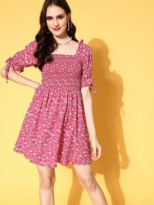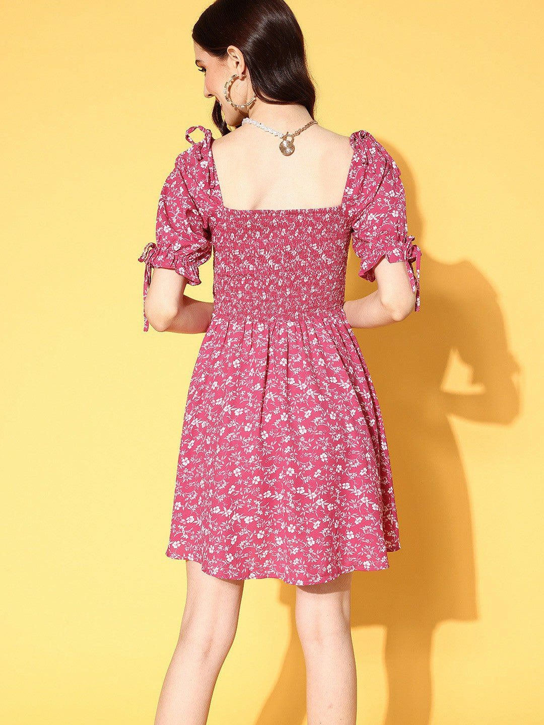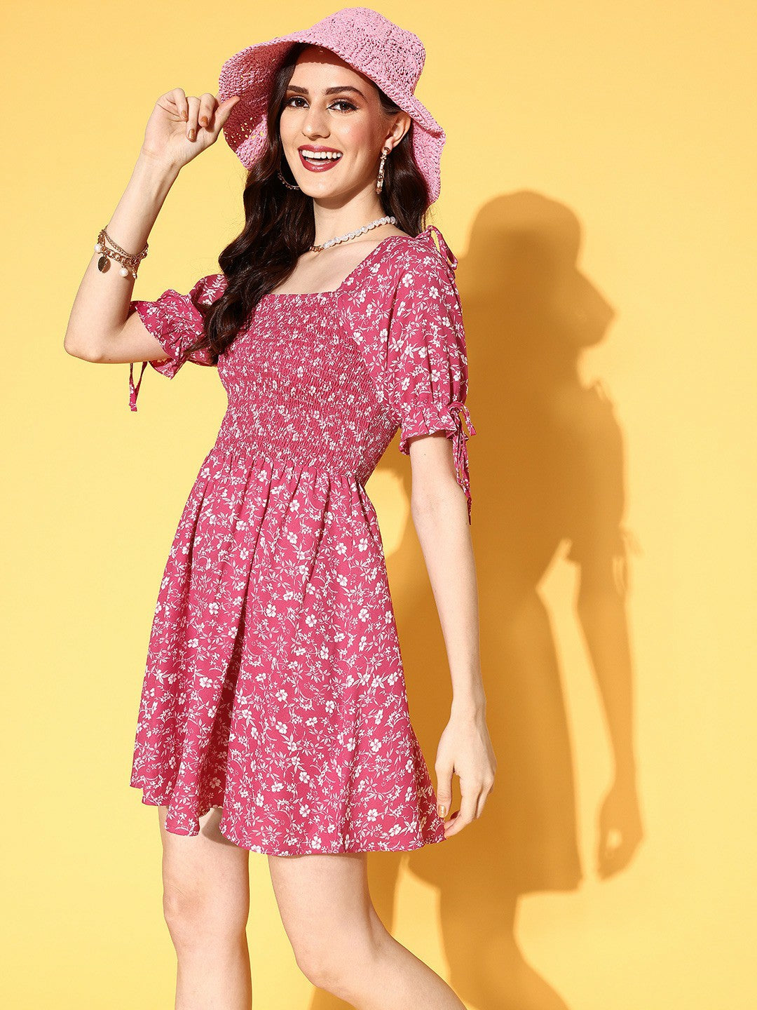 Berrylush Women Pink & White Floral Printed Square Neck Smocked Back Crepe A-Line Mini Dress
