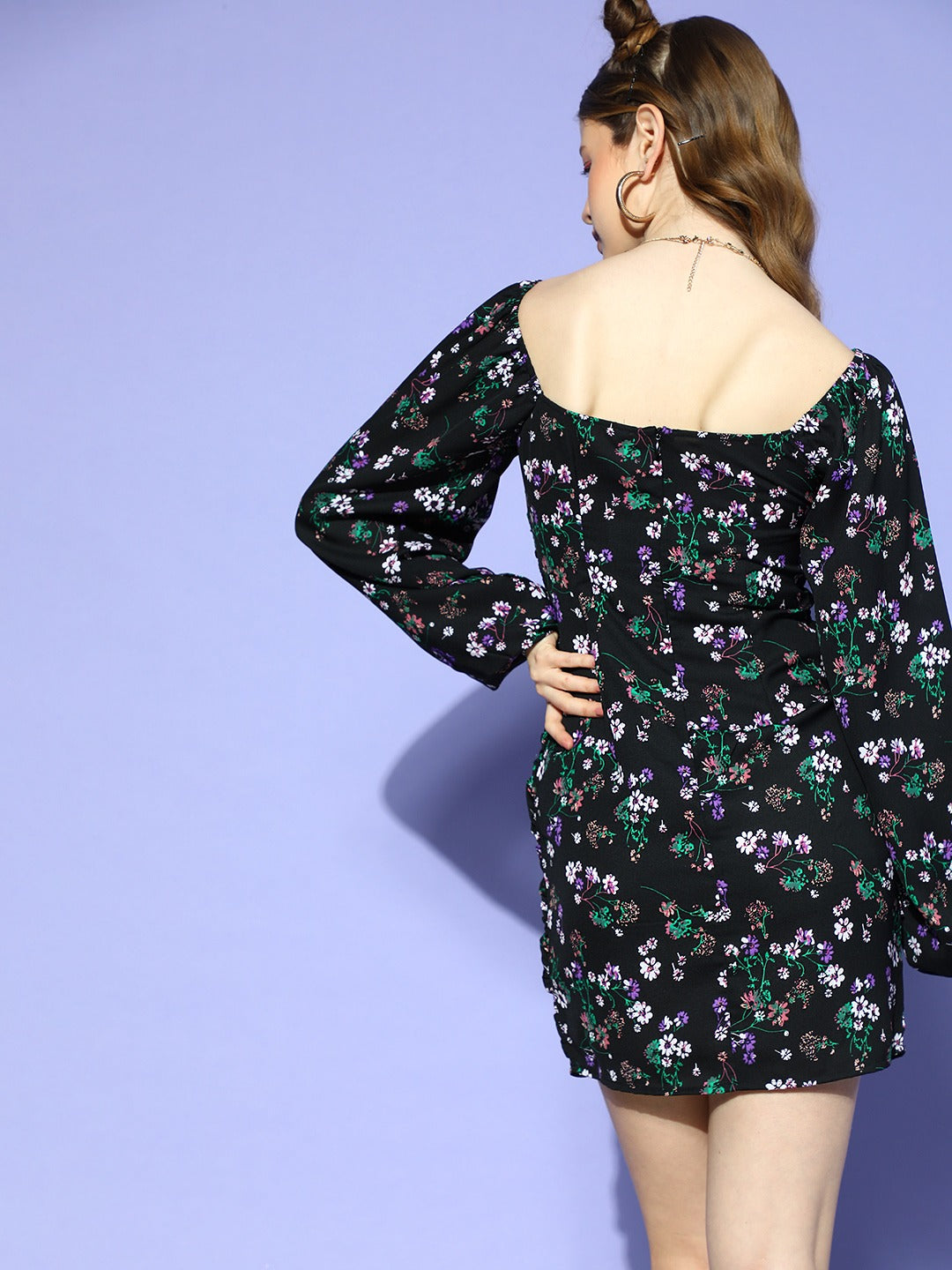 Berrylush Women Black & Green Floral Printed Square Neck Bishop Sleeve Ruched Sheath Mini Dress