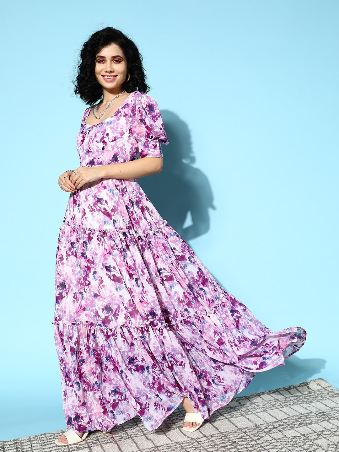 Hold to the dreamiest outfit this summer season by adding to your cart this captivating White and Purple Floral Printed Tiered Flared Maxi Dress designed by Berrylush for its exclusive casual wear collection. Beautifully decorated with a white and purple floral print that assembles a majestic design containing the beauty of nature. Styled with pleated surface styling that adjoins small pleats and frills to this dress to lend it a tiered fashion statement. Moreover, the flared hemline magnifies the overall volume of this dress with additional flair. Enjoy an outdoor picnic with your friends while looking gorgeous by wearing this dress with pink wedges, pearl earrings, and a cute handbag.