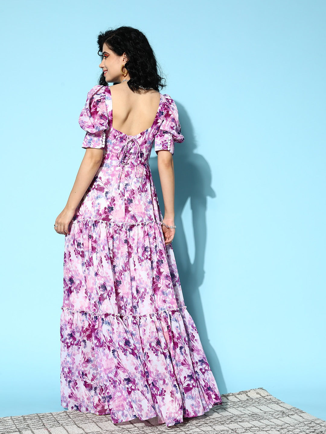 Berrylush Women White & Purple Floral Printed Sweetheart Neck Tie-Up Back Flared Maxi Dress