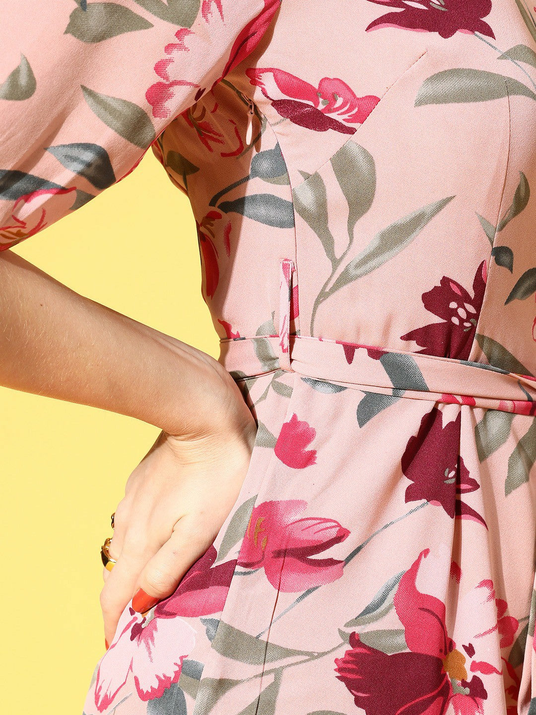 - Rose shade and floral print make your look appear pleasing with a calming vibe