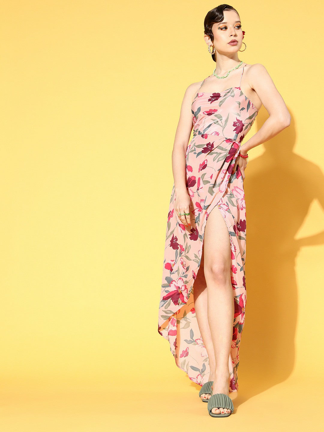 Berrylush Women Rose Floral Printed Tie-Up Neck Backless Thigh-High Slit Asymmetric Maxi Dress