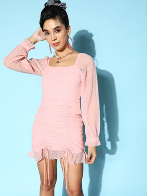 Amp up the voguish charm of your casual contingent with minimalistic yet utterly chic statement pieces just like this cute Solid Pink Dobby Weave Georgette Bodycon Mini Dress from Berrylush. Rendered from high-quality georgette fabric that gives this dress has a flattering appearance with crinkled texture, flowy structure, and limitless breathability. The attached polyester lining offers an irritation-free touch with opaque transparency and a luxurious note. In addition, the tie-up surface styling adjoins the decorative design with ruched and textured detail in this dress. Complete your casual look stylishly by wearing this dress with a pair of pink block heels, matching earrings, and a cute pink handbag.