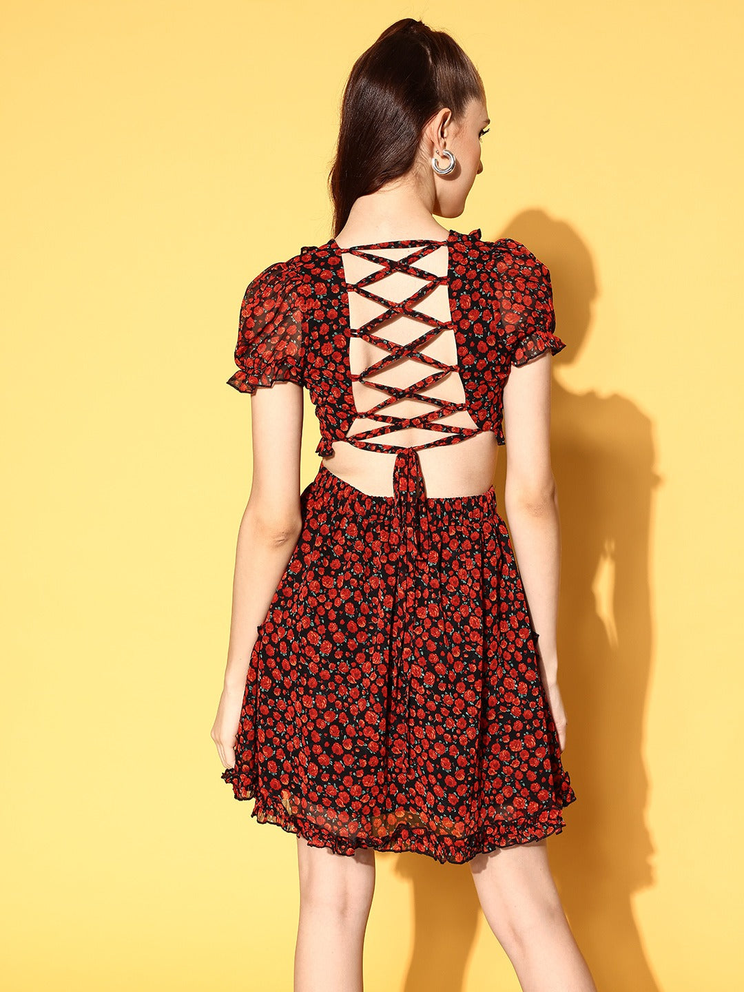 Berrylush Women Black & Red Floral Printed V-Neck Georgette Cutout Tie-Up Back Flared A-line Mini Dress
