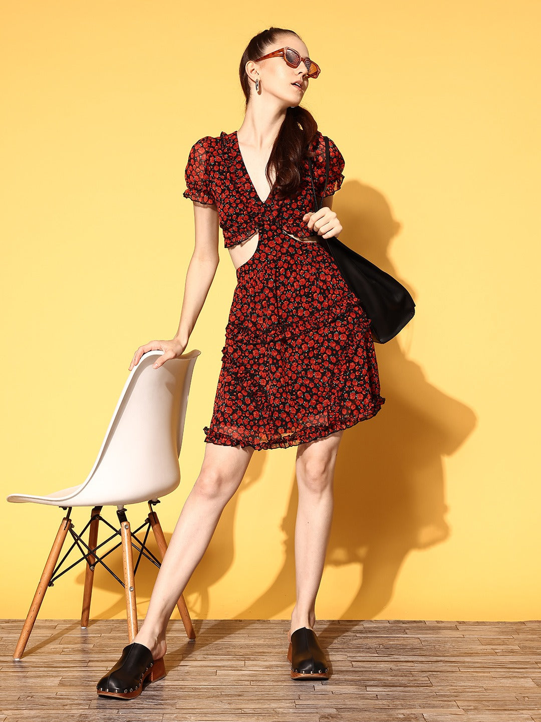 Exude the daytime glamour this summer season by opting for this beautiful Black and Red Floral Georgette A-Line Mini Dress launched from the latest floral print and pattern collection of Berrylush. Framed in an A-line shape to offer a figure-flattering silhouette to this dress that elegantly shows off your natural curves. Spun from georgette fabric that keeps this dress super light in weight with uninterrupted breathability. The mini length of this dress lends your legs appropriate exposure for hassle-free movements. Complete your look elegantly by wearing this dress with a pair of caged heels, red hoop earrings, and a pretty side bag.