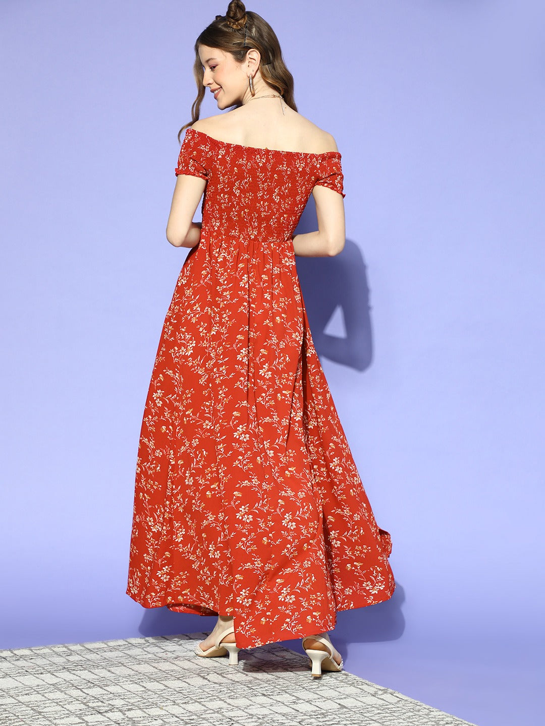 Berrylush Women Red & White Floral Printed Off-Shoulder Neck Thigh-High Slit Crepe Smocked Maxi Dress