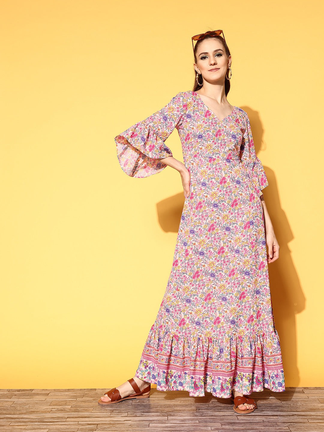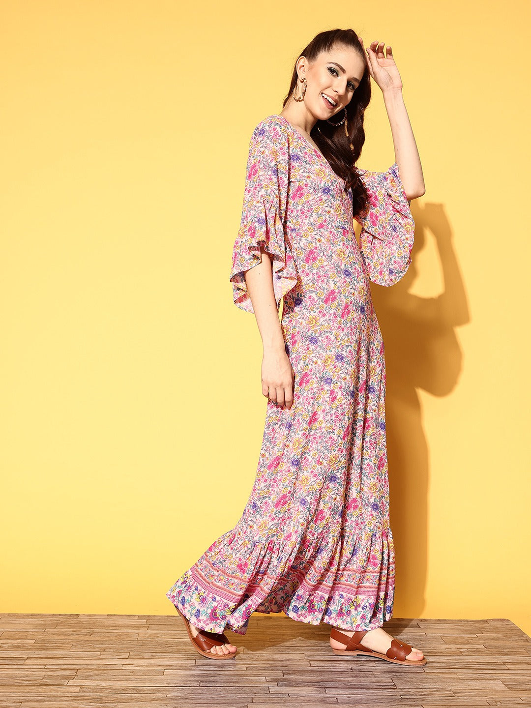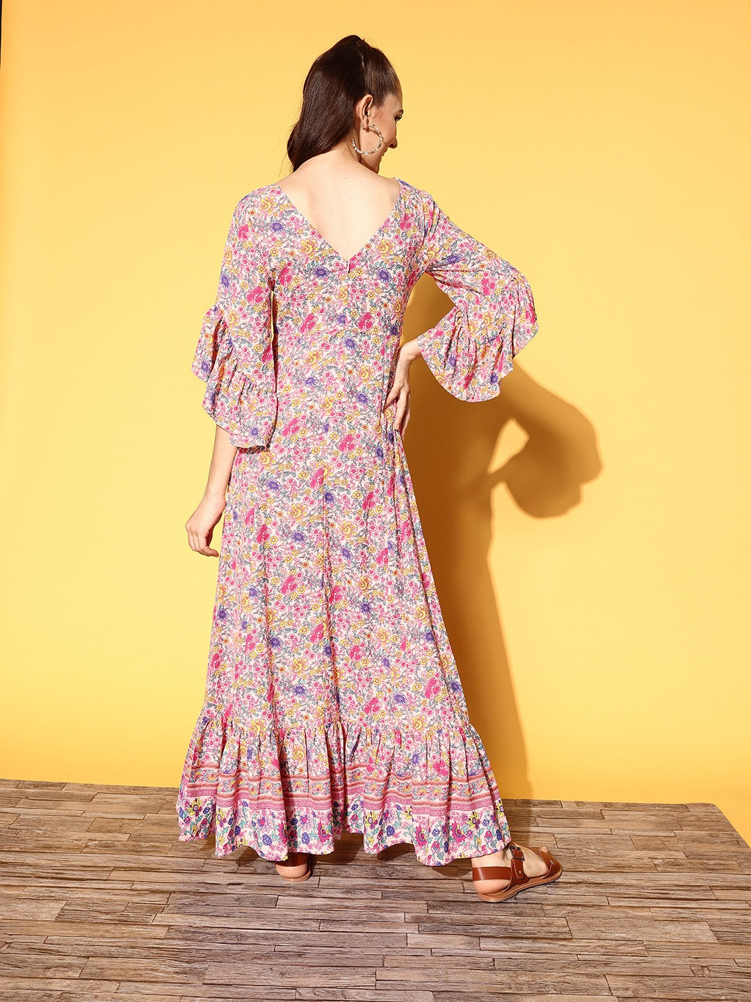 Berrylush Women Pink & Lavender Floral Printed V-Neck Three-Quarter Sleeve Crepe Ruffled Maxi Dress