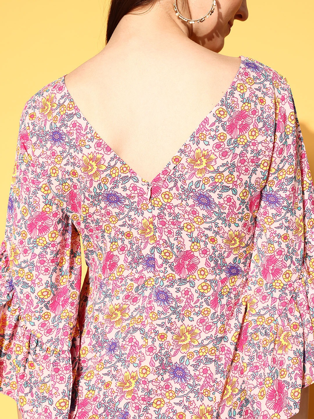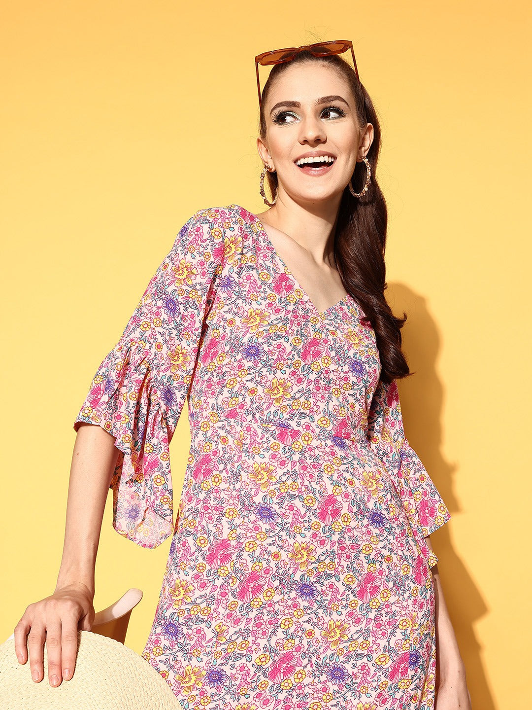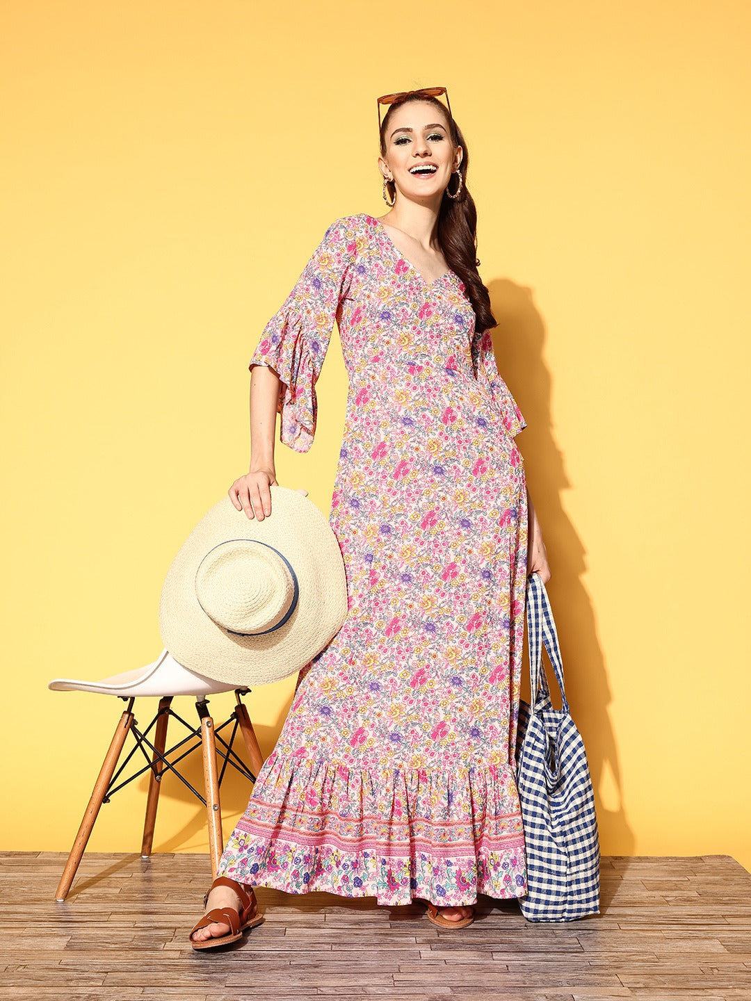 Berrylush Women Pink & Lavender Floral Printed V-Neck Three-Quarter Sleeve Crepe Ruffled Maxi Dress