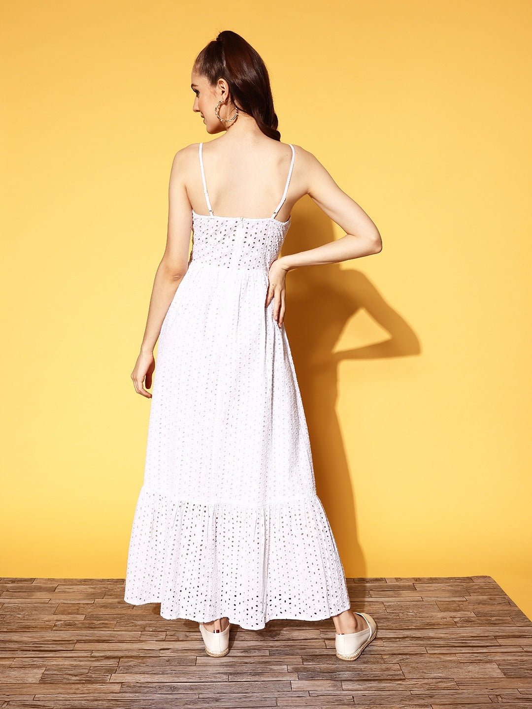 It's time to introduce effortlessly chic and comfortable style options to your outdoor assortment just like this sassy Self Design White Cotton Schiffli Maxi Dress designed by Berrylush. Spotlighting the charming amalgamation of white shade with a self-design pattern that gives this modern appeal with eye-catching details. The shoulder straps offer this dress a supportive structure and weight-balancing effect to avoid stress on your body. In addition, the flared hemline lends this dress a voluminous look with attached flair and a bouncy drape. Wear this maxi dress with a pair of high-heels, pearl earrings, and a matching sling bag for a stunning look to attend picnic events.