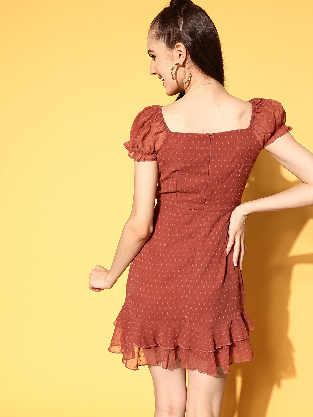 Berrylush Women Solid Brown Dobby Weave Sweetheart Neck Georgette Flounce Hem Ruffled A-Line Mini Dress