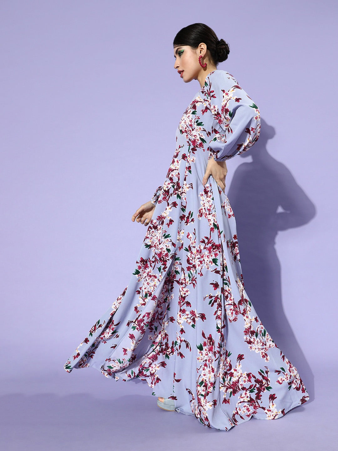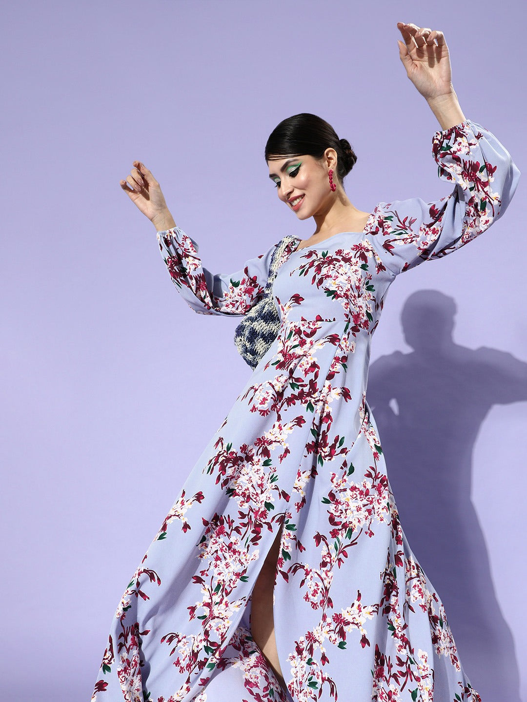 Refresh your casual wardrobe with stylish and vibrant hues like this stunning Blue Floral Printed Square-Neck Thigh-Slit Maxi Dress from Berrylush. You will surely find this dress adorable as its beautifully designed square neck appear your neckline with a broad and dramatic shape further adding gleaming essence to your casual outlook. The long puffed sleeves present a flattering appeal to your arms along with protection from sunburn on hot-sunny days while the blue colour complemented with floral print assembles your youthful beauty with the tint with romantic traits of nature. Maxi length and flared further add feminine charm to your lower half. You can wear this beautiful maxi dress with your favourite pair of high-heels and a stylish clutch to get an astonishing final look.