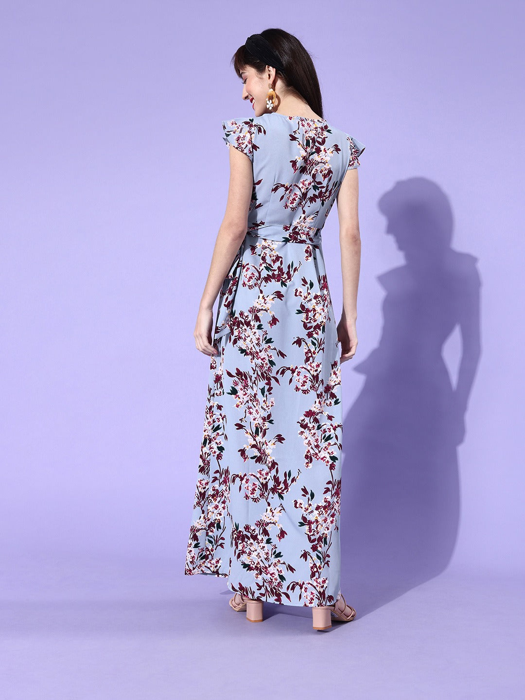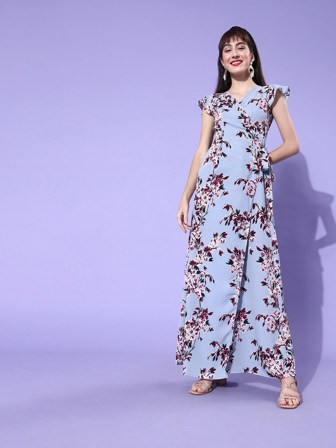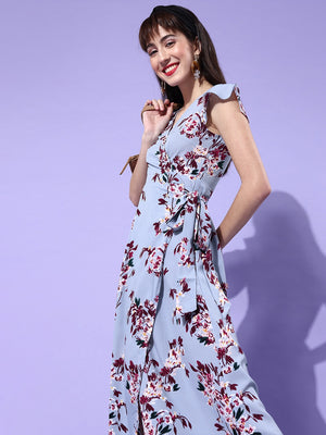 Berrylush Women Blue & Red Floral Printed Side Tie-up Wrap Maxi Dress