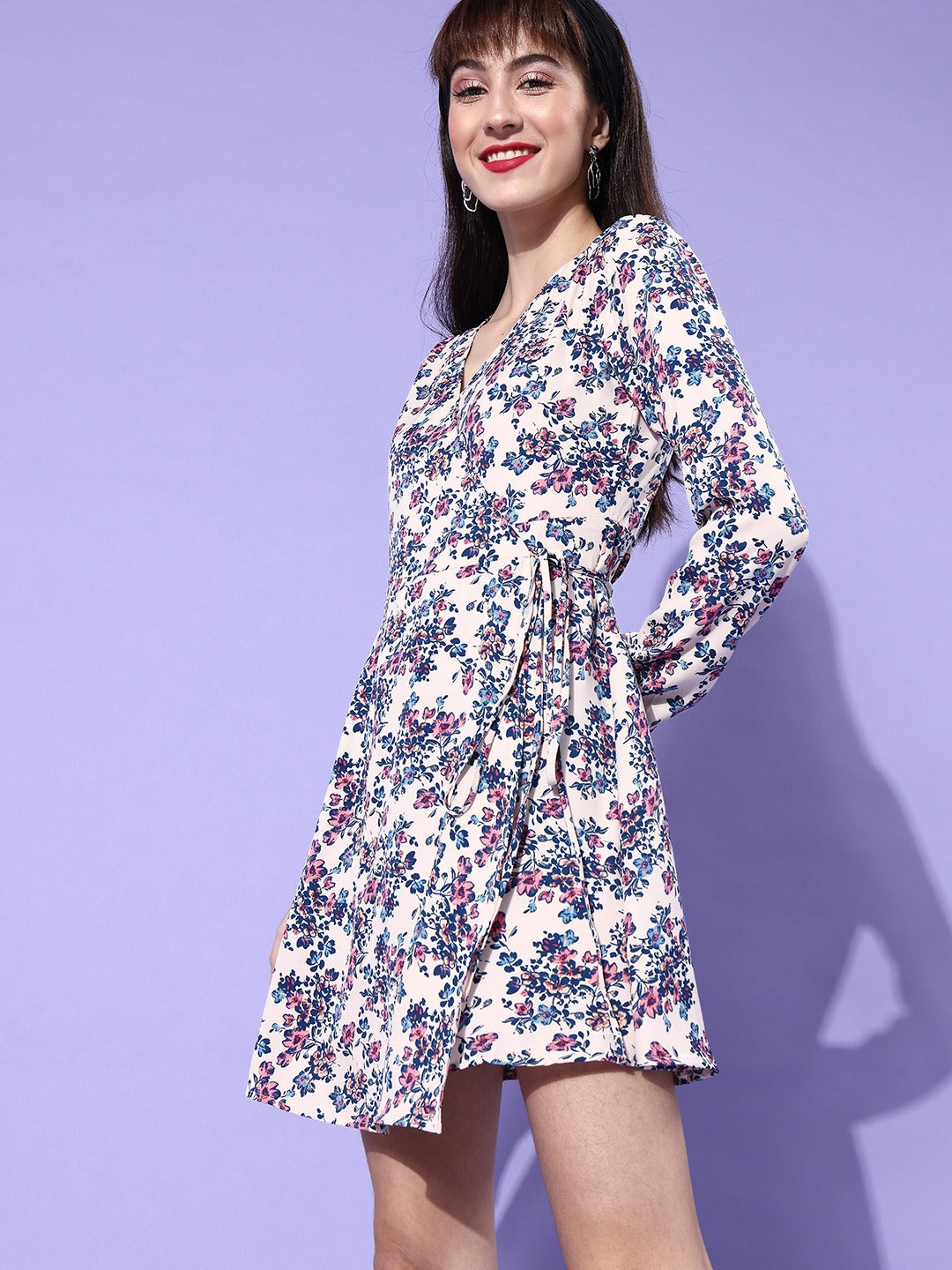 Berrylush Women White Floral Layered Fit & Flare Wrap Mini Dress