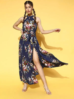 If you are in love with floral print and want to add some royal vibe to your casual wardrobe, then this charming Navy Blue Floral Printed Round-Neck Waist Tie-Up Maxi Dress from Berrylush is a perfect option for you. This dress gets you a cinematic casual outlook with its tie-up detail element which enables you to get contouring fit an hour-glass figure. Designed with a round neck to assemble a delicate and formal appeal to your neckline and the sleeveless feature give ventilation to your arms with an alluring appeal. The navy blue shade of the maxi dress reflects a luxurious and royal vibe while the floral print adds the tint of nature to your look. Match up this bedazzling maxi dress with a pair of high-heels and a stylish side bag to get a feminine sophisticated look.