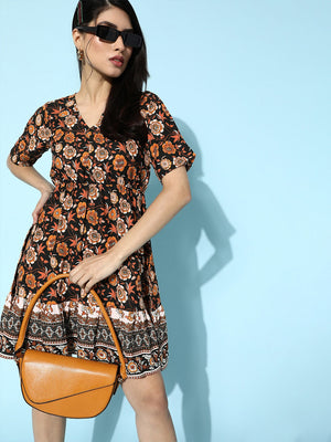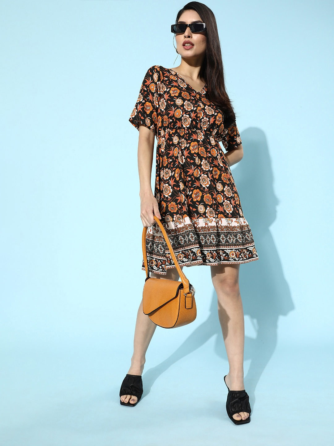 Berrylush Women Black Floral Printed V-Neck A-Line Mini Dress