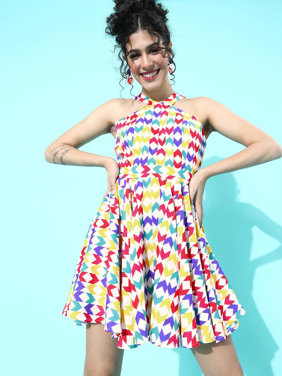 Multicolour is the new basic trend of the summer season, thus add some funky and playful vibe to your casual wear with this amazing White Halter Neck Flared Fit & Flare Mini Dress from the geometric print collection of Berrylush. You are sure to love this dress as the halter neck gets your neckline a sophisticated and attractive view. The most admirable element of this dress is its geometric multicolour print on the white shade which takes your causal personal style to a new height as it brings out monochromatic essence from your look. The crepe polyester fabric keeps the dress lightweight and airy making it a suitable option for long hot days. Mini length with flared hemline assembles an exotic appeal with fleek movements. Wear this dazzling mini dress with block heels and hoop earrings to get a stunning appearance for your lovely date or weekend picnic plans.