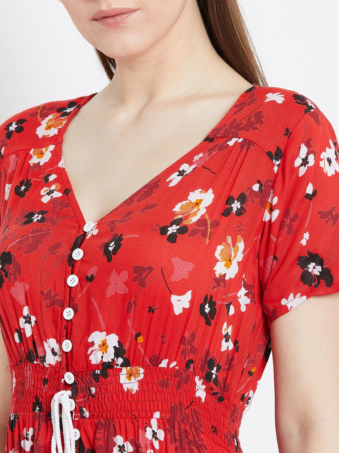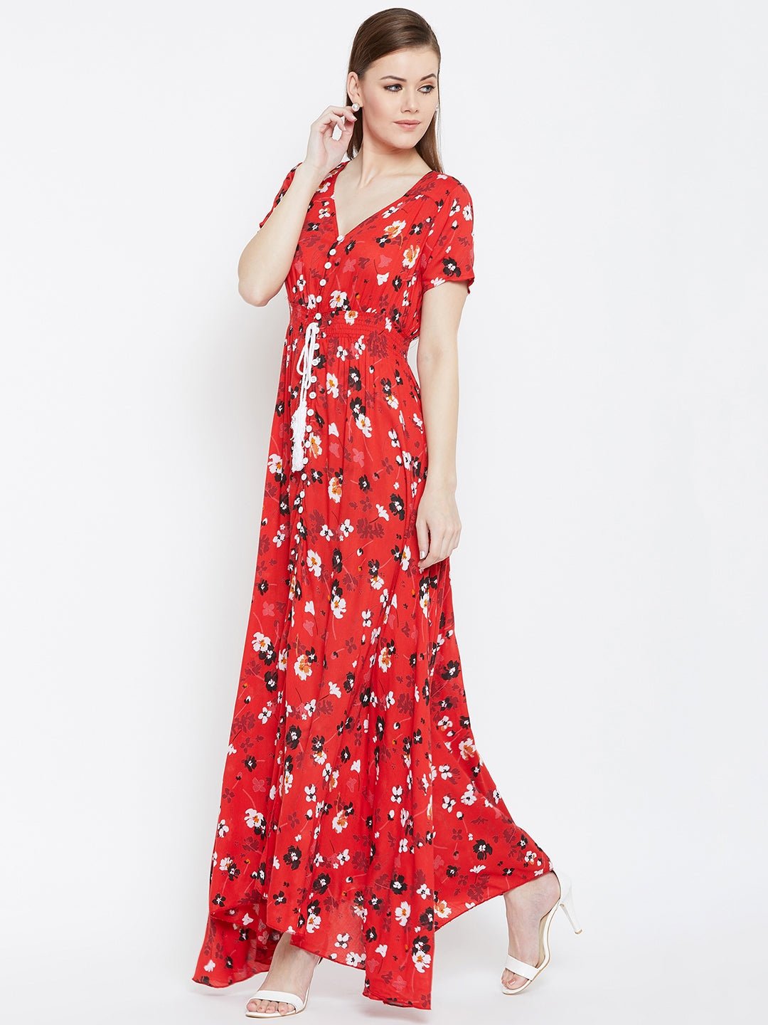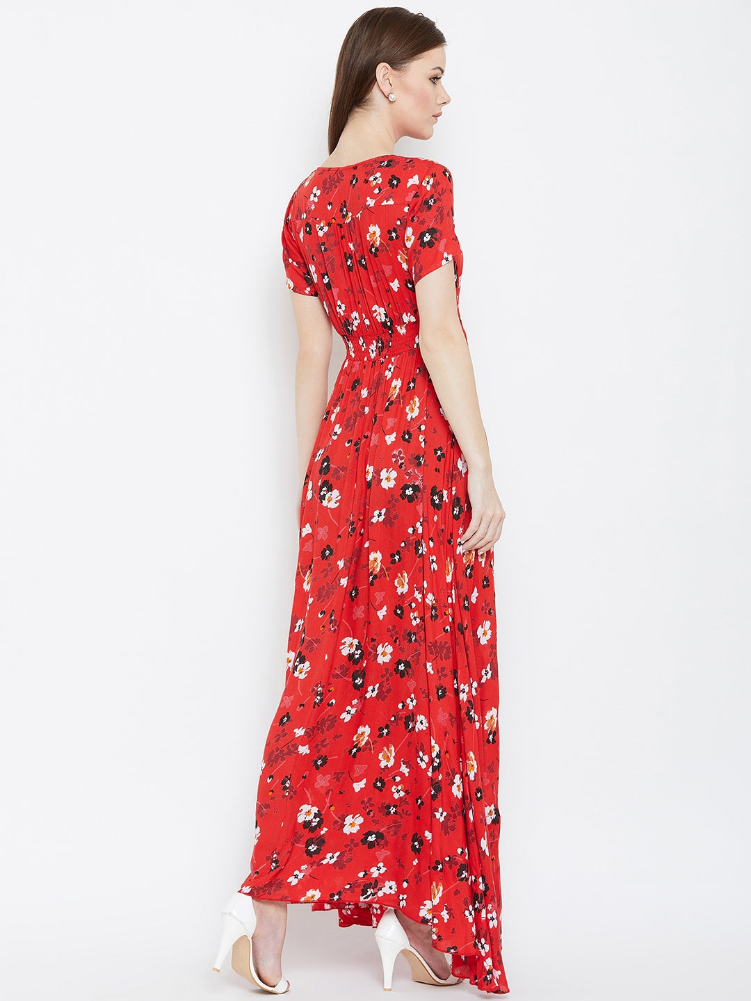 Berrylush Women Red & White Floral Printed V-Neck Crepe Smocked Maxi Dress