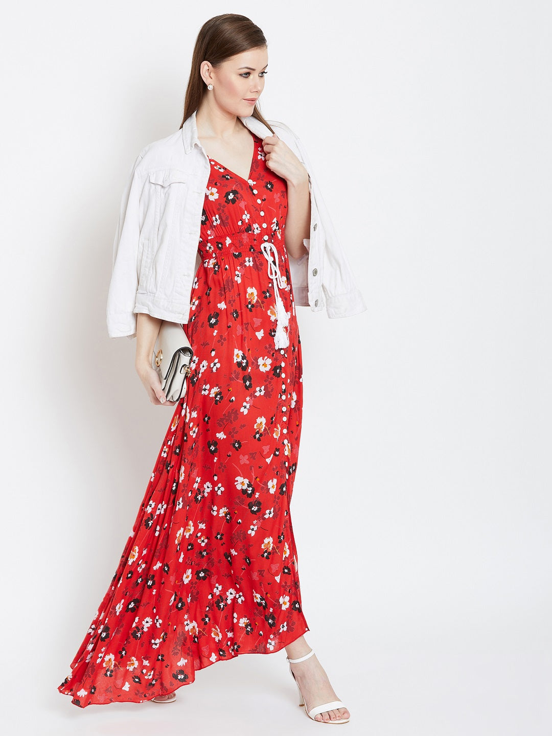 Enhance your everyday style this spring season by bringing home this ravishing Red & White Floral Printed V-Neck Crepe Smocked Maxi Dress from Berrylush. You will find this dress striking and fashionable as the asymmetric hemline adds a decorative and lustrous sheen to your lower half further depicting a boho-chic casual look. The beautiful combination of red shade with white floral print presents a bold and powerful appearance accompanied by romantic hues of nature. Concealed zip closure lets you fasten this dress conveniently and securely for a comfortable fit. Partner up this magnetizing maxi dress with a pair of strappy heels, floral hoop earrings, and a side bag to create a sophisticated look.