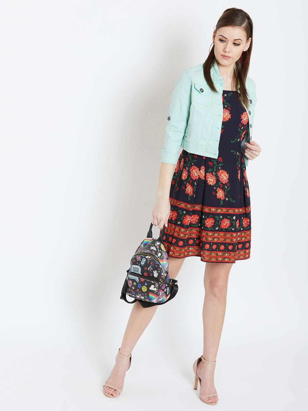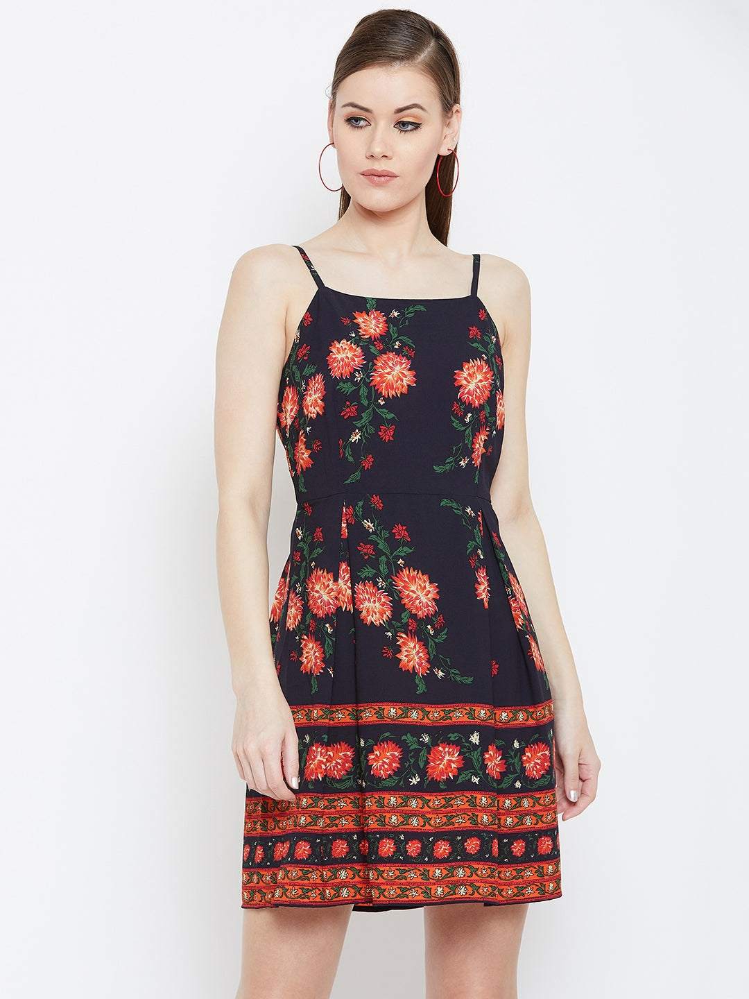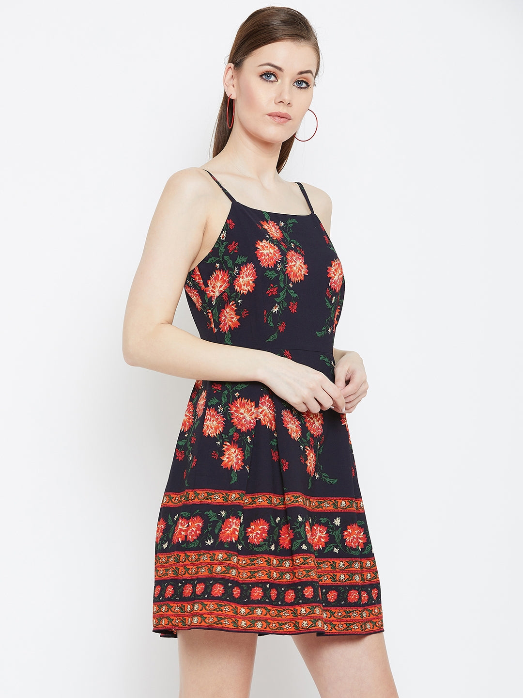 Berrylush Women Navy Blue & Orange Floral Printed Square Neck Flared Fit & Flare Mini Dress